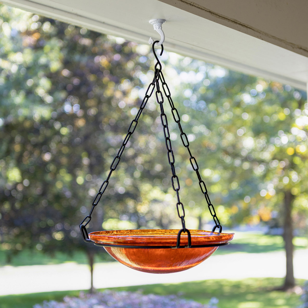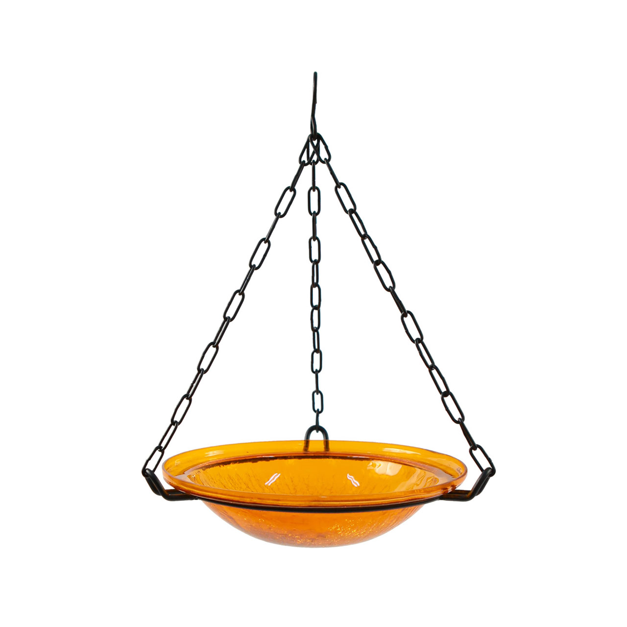 - Hanging Ring has three chains connected by a top hanging hook, glass bowl is designed to drop into the supporting ring. All metal pieces are finished in a Black powder coating for maximum weather-resistance.