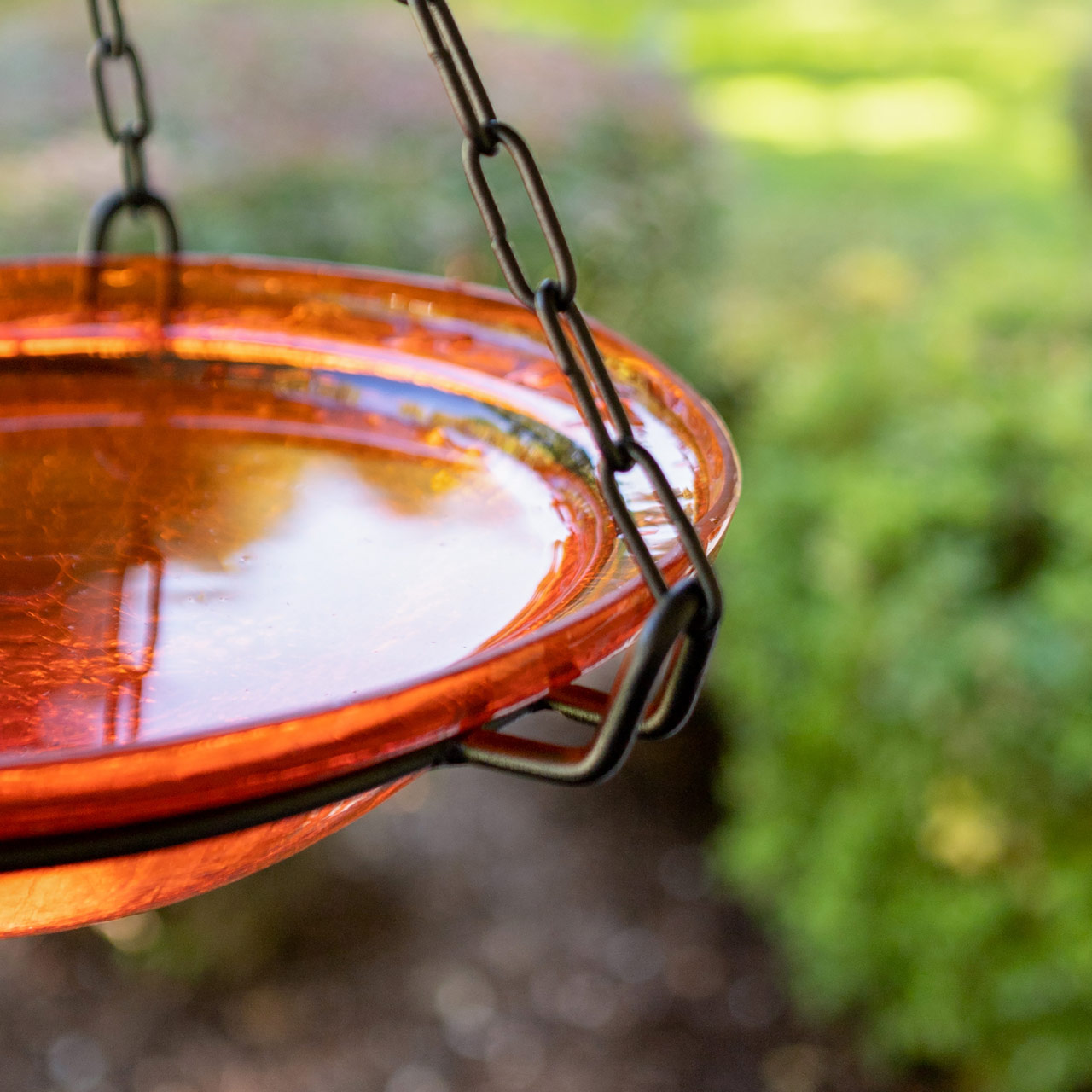Reflective and brilliant, our Crackled Glass Birdbath Bowls are sparkling gems in the garden. Bowls are made from hand-blown glass in five vibrant colors, measuring 12 ½” diameter x 2 ½”D. Available for purchase alone, or with our wrought iron Birdbath Hanging Ring or Cradle and Garden Stake, these colorful birdbaths create a bright pop anywhere in the garden. Birds will enjoy a safe place to cool off and drink some water, and gardeners will love having this beautiful piece to accent the plantings. These bowls are also designed to fit our wrought iron bases the Short Stand (GBS-22)and Ring Stand (FB-14) for table top or garden. Makers of fine quality goods for the home and garden since 1994, we offer a full line of Achla Designs wrought iron landscape structures, plant supports and stands, birdbaths and other decorative garden elements for the patio, porch, deck and yard.