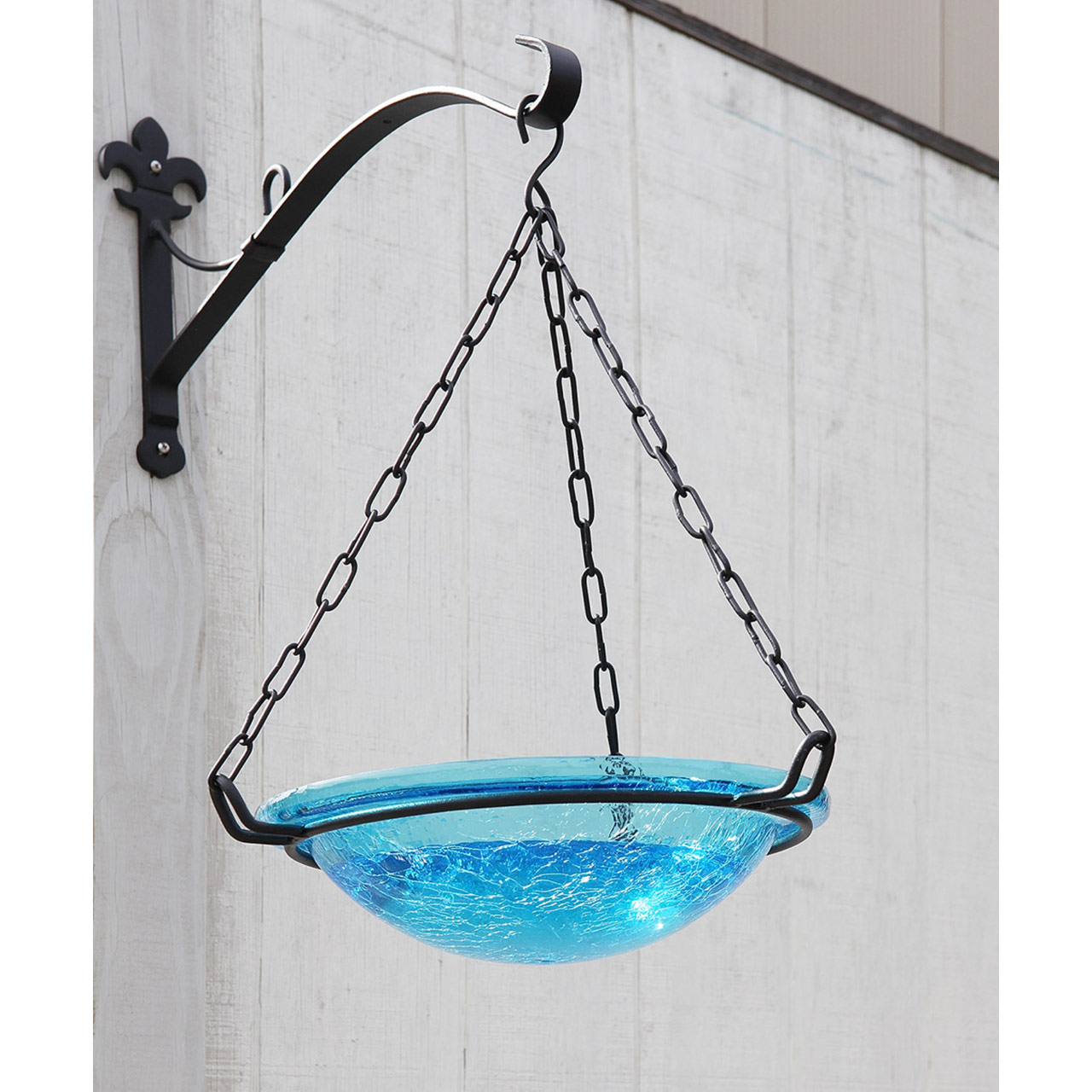 - Hanging Ring has three chains connected by a top hanging hook, glass bowl is designed to drop into the supporting ring. All metal pieces are finished in a Black powder coating for maximum weather-resistance.