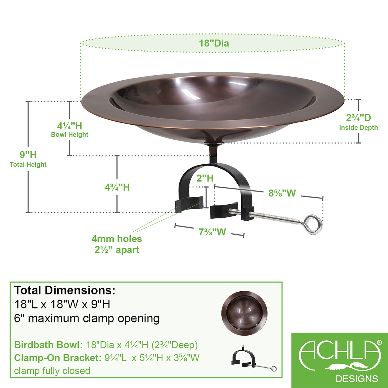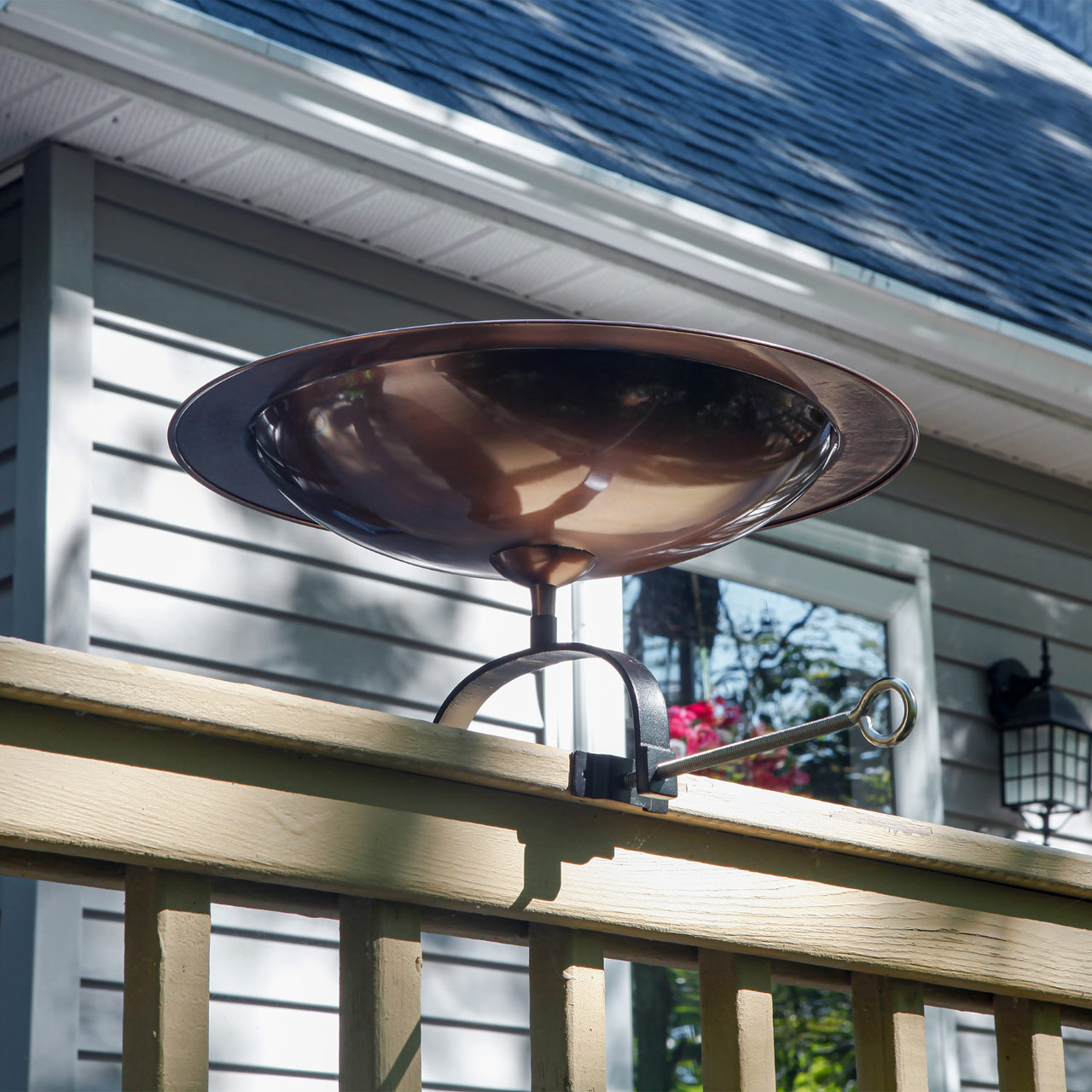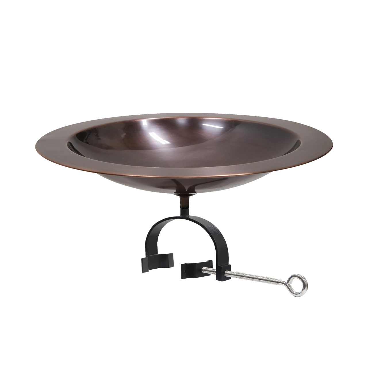 One of our larger birdbaths, the 18" Classic Copper Birdbath is a wide, shallow rimmed bowl, with smooth Antique Copper Finish. The threaded base on the underside of the bowl attaches to a sturdy three-footed wrought iron stand. This birdbath makes a beautiful garden accent piece placed on a deck, tabletop, or pedestal. This is a perfect choice for rock gardens, tabletops, and low border plantings too.