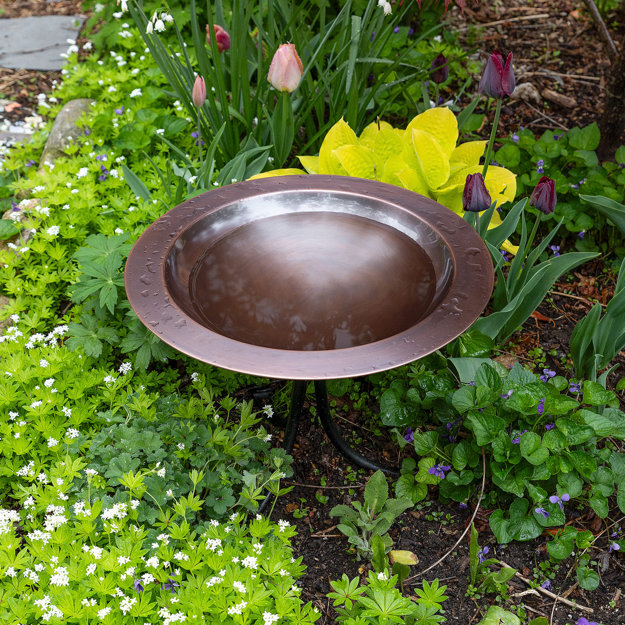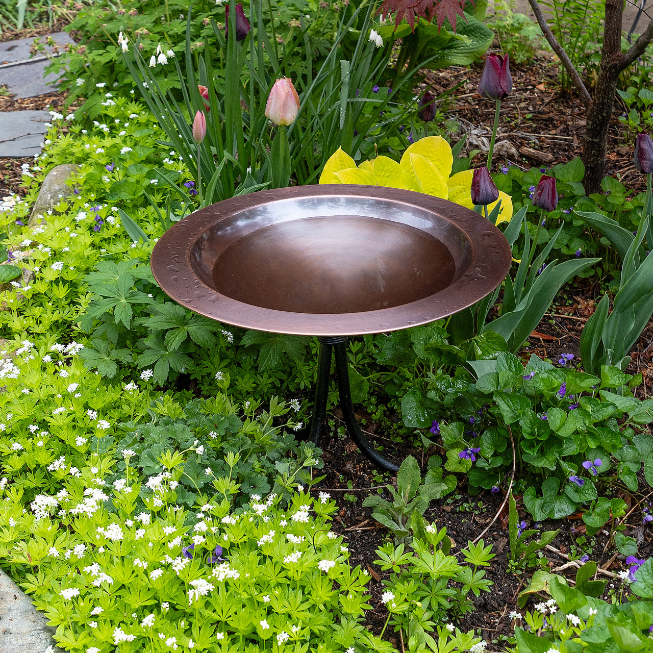 One of our larger birdbaths, the 18" Classic Copper Birdbath is a wide, shallow rimmed bowl, with smooth Antique Copper Finish. The threaded base on the underside of the bowl attaches to a sturdy three-footed wrought iron stand. This birdbath makes a beautiful garden accent piece placed on a deck, tabletop, or pedestal. This is a perfect choice for rock gardens, tabletops, and low border plantings too.