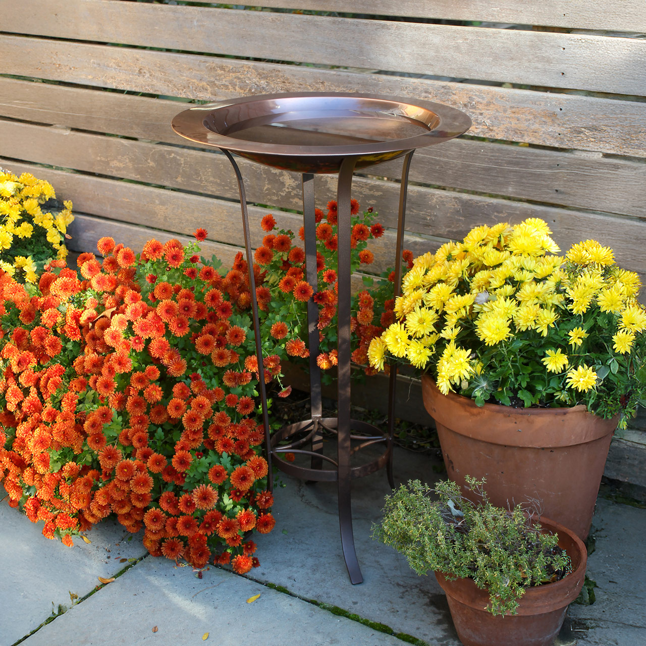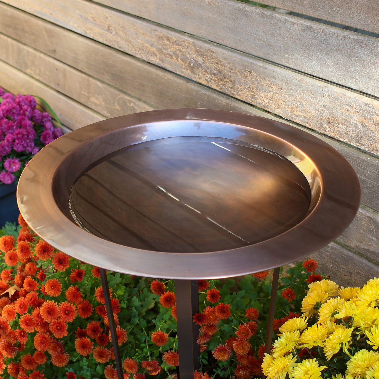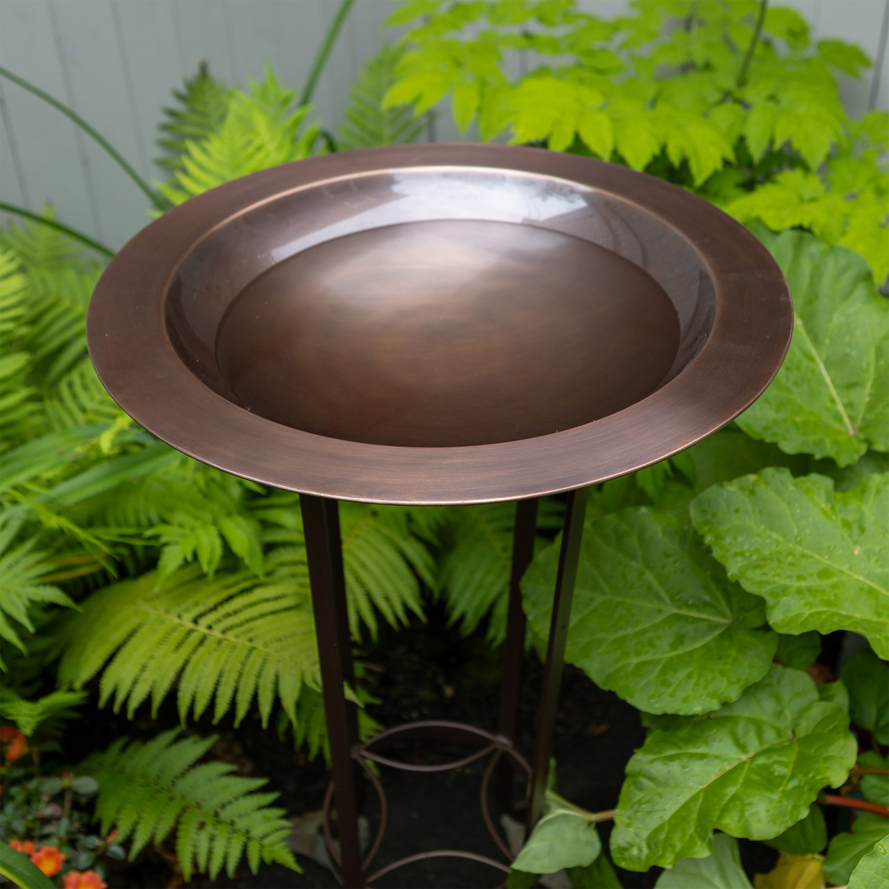 One of our larger birdbaths, the 18" Classic Copper Birdbath is a wide, shallow rimmed bowl, with smooth Antique Copper Finish. Paired with our Tulip Stand, it makes a striking garden accent that is a ideal for a hard landscape surface and can also be placed in any level area of the garden. The wrought iron two-tiered stand holds the bird bath on the 15" diameter upper ring, and the lower shelf can hold a small pot or planter. Roman Bronze powder coated finish is a lovely complement to the copper bowl.