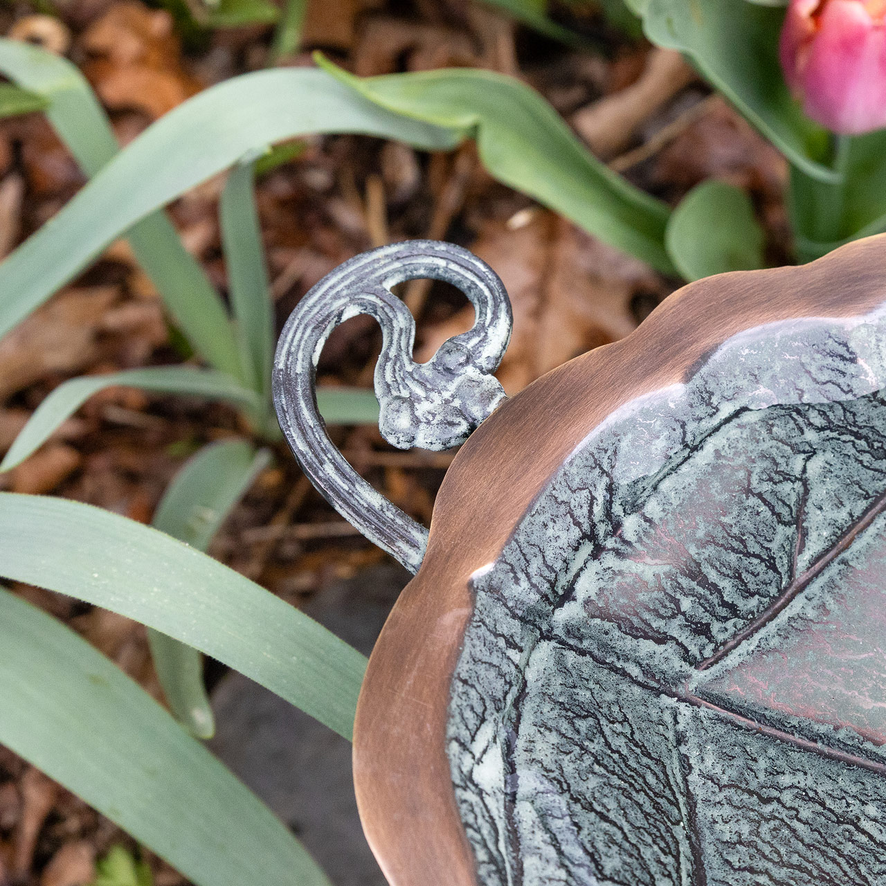 This Aspen Leaf Birdbath has a small Tripod Stand that can be placed on a deck or tabletop, or a pedestal. The left-shaped copper bowl has a curled stem detail, embossed design and verdigris finish. The threaded base on the underside of the bowl attaches to the small three-footed wrought iron stand and is perfect for rock gardens, tabletops, and low border plantings.