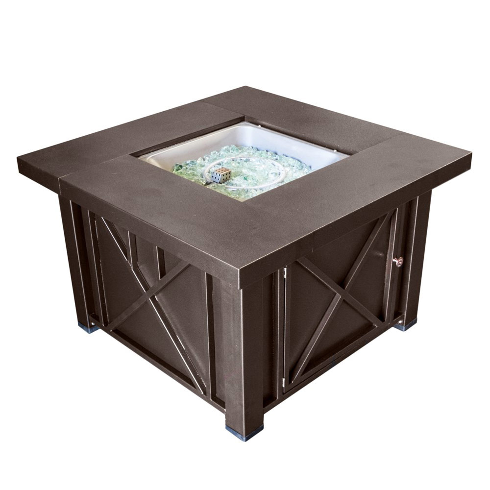 Enhance your outdoor space with the Hammered Bronze Square Fire Pit, featuring elegant crossbar detailing that blends style and functionality. With a 38" square tabletop and 24" height, this fire pit provides a warm and inviting centerpiece for patios, decks, or backyard gatherings. The included 19" square burner lid doubles as a protective cover when not in use.