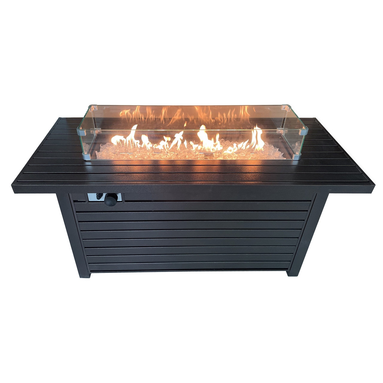 Delivering up to 50,000 BTUs of heat, this propane fire pit provides warmth and ambiance for outdoor gatherings while keeping the propane tank discreetly hidden inside the base. A thermocouple failure device enhances safety by automatically shutting off the gas if the flame is extinguished. Fire glass is included for added visual appeal, and the glass wind screen helps maintain a steady flame in breezy conditions. When not in use, the included burner lid transforms the fire pit into a functional outdoor table. Measuring 54" x 22" x 25", this fire pit offers the perfect balance of performance, durability, and refined outdoor style.