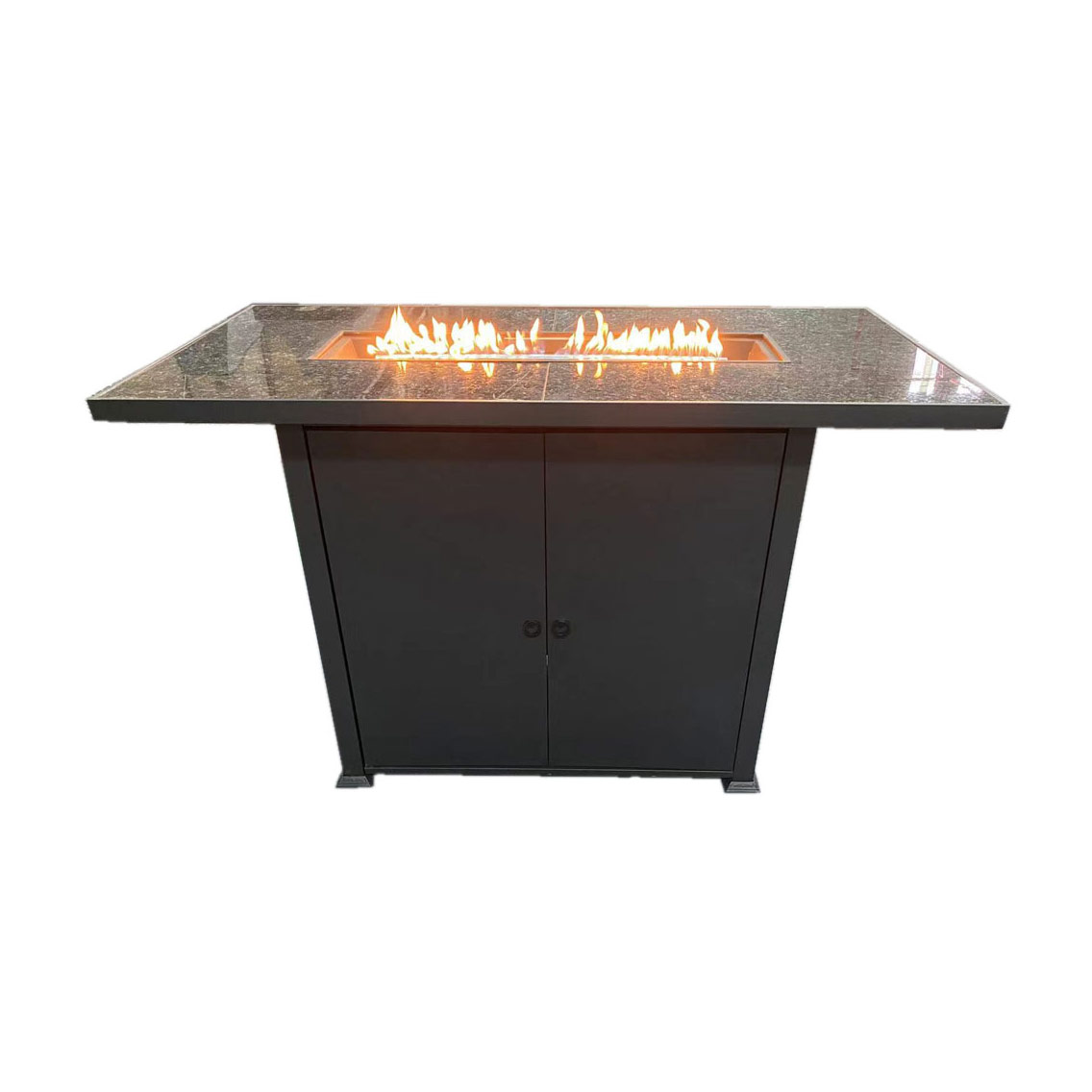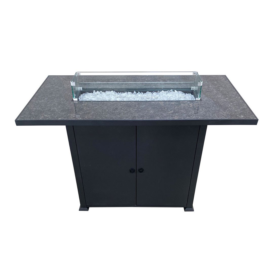 Bring modern elegance and powerful warmth to your outdoor entertaining space with this Rectangular Bar Height Granite Top Fire Pit with Wind Screen. Designed for elevated comfort and style, this propane fire pit table features a sleek black frame paired with a polished granite tabletop, creating a striking centerpiece for patios, decks, and outdoor lounge areas.