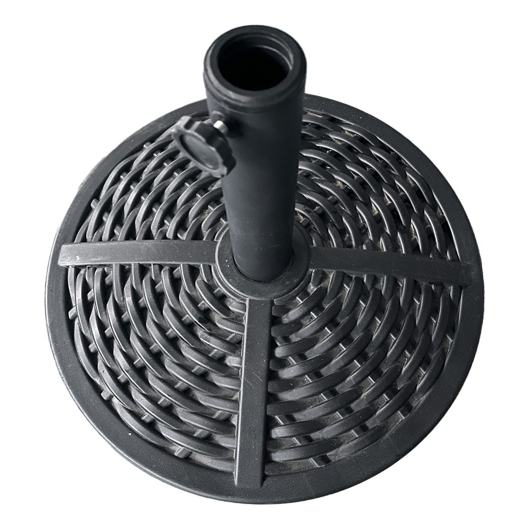 This umbrella base is designed to fit poles ranging from 1 1/2 inches to 1 3/4 inches in diameter, making it compatible with many standard market umbrellas. Perfect for patios, decks, and outdoor dining areas, this concrete-filled umbrella base combines lasting durability with a classic wicker-inspired design.