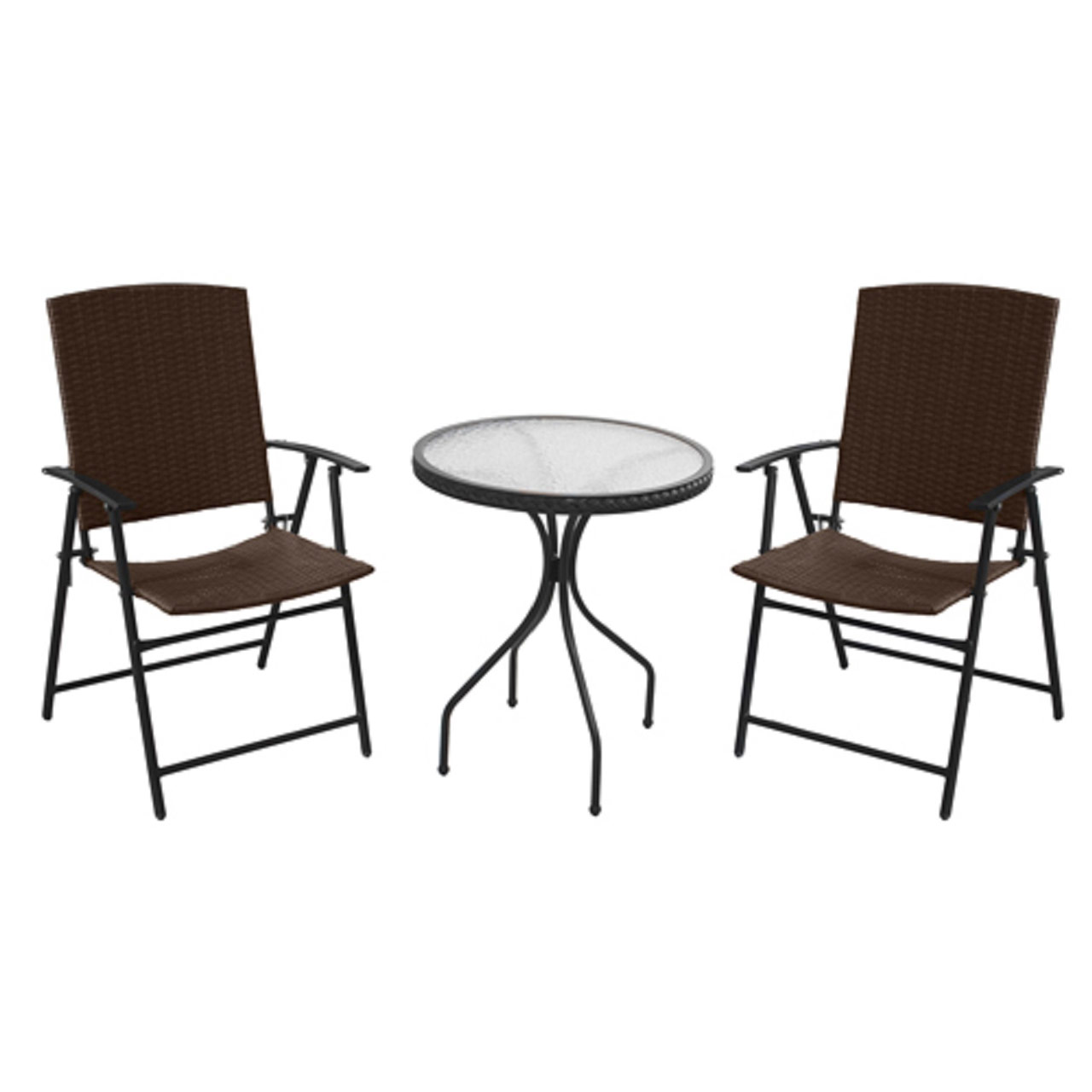 The chairs fold flat for easy storage, while the table features a 24" diameter top with 5mm tempered frosted glass for a sleek and safe surface. Each chair measures 21.8" W x 25.2" D x 37" H, providing comfortable seating for adults. Minimal assembly is required, making setup quick and hassle-free. This set combines elegance and practicality, elevating your indoor or outdoor living space with ease.