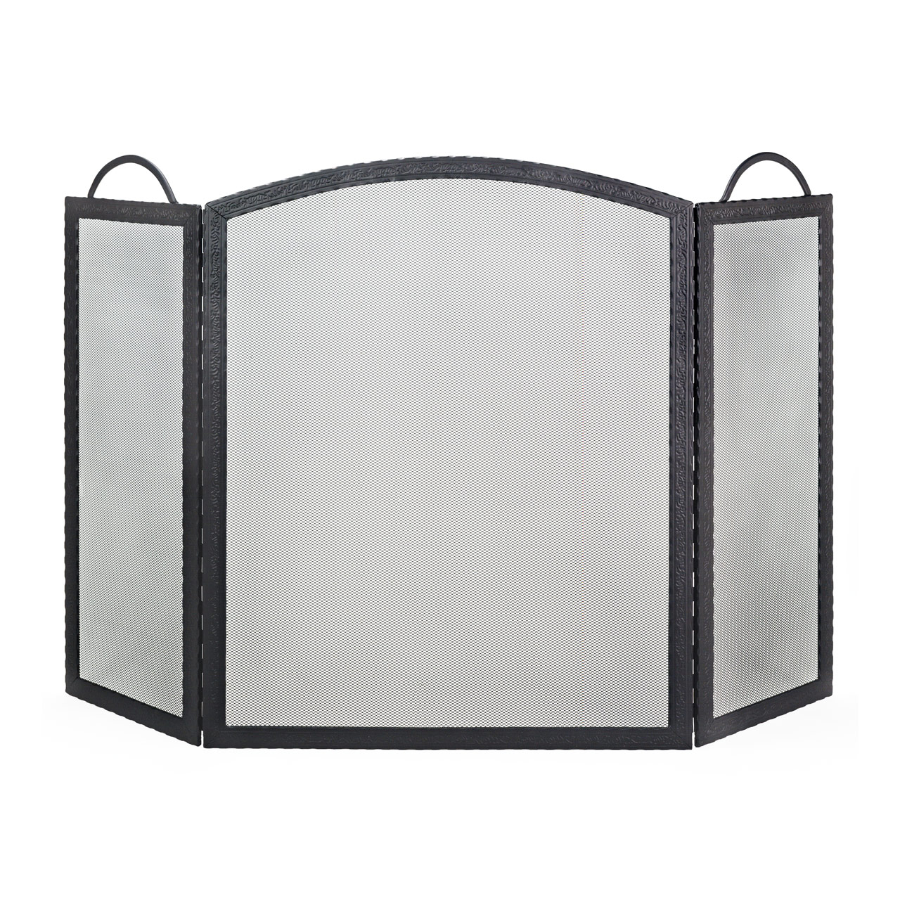 The Dagan Three Fold Black Wrought Iron Arched Fireplace Screen offers classic style and dependable protection for your hearth. Crafted with a high-quality wrought iron frame, this three-panel arched screen features a beautifully embossed design that adds texture and traditional charm to any fireplace setting. Its folding design allows for easy positioning, while the sturdy construction helps shield your home from sparks and embers. Measuring 32.5 x 52 inches (H x W) and weighing 30 pounds, this elegant fireplace screen provides both durability and timeless appeal.