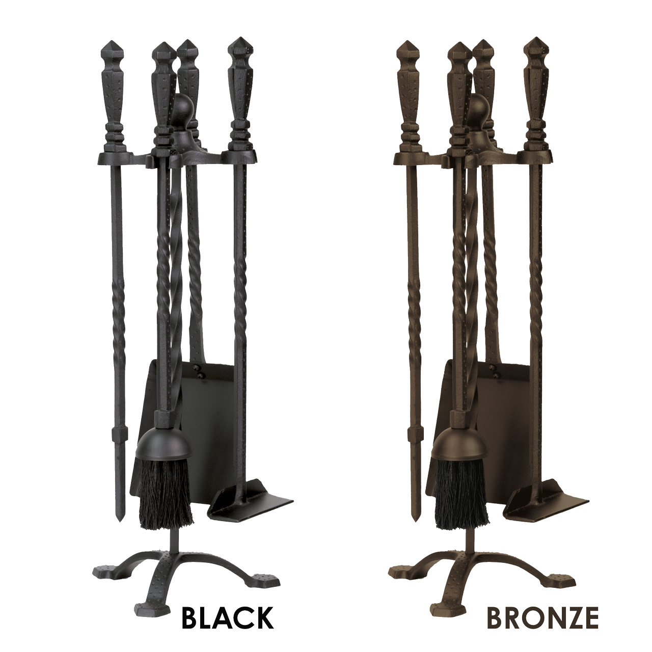 The Dagan Five Piece Wrought Iron Stove Fireplace Tool Set adds both style and function to your fireplace area. Crafted from durable wrought iron with your choice of black or bronze finish, this elegant fire set is designed to last for years of reliable use. The beautifully twisted stand design complements any décor while keeping your fireplace tools neatly organized. This 21.75-inch tall set includes a brush, poker, shovel, scraper, and stand—everything you need to maintain a clean and inviting hearth.