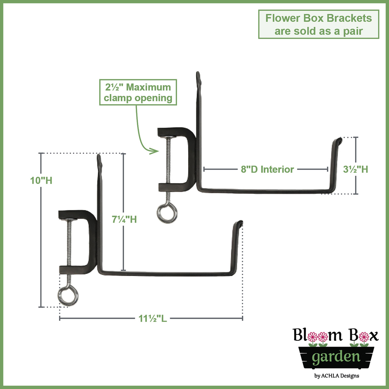 - Designed for flat deck or handrails, two 8-inch Clamp-On Brackets (2 inch maximum clamp opening) hold the flower box, place brackets at desired distance apart and manually secure with the thumb screw
