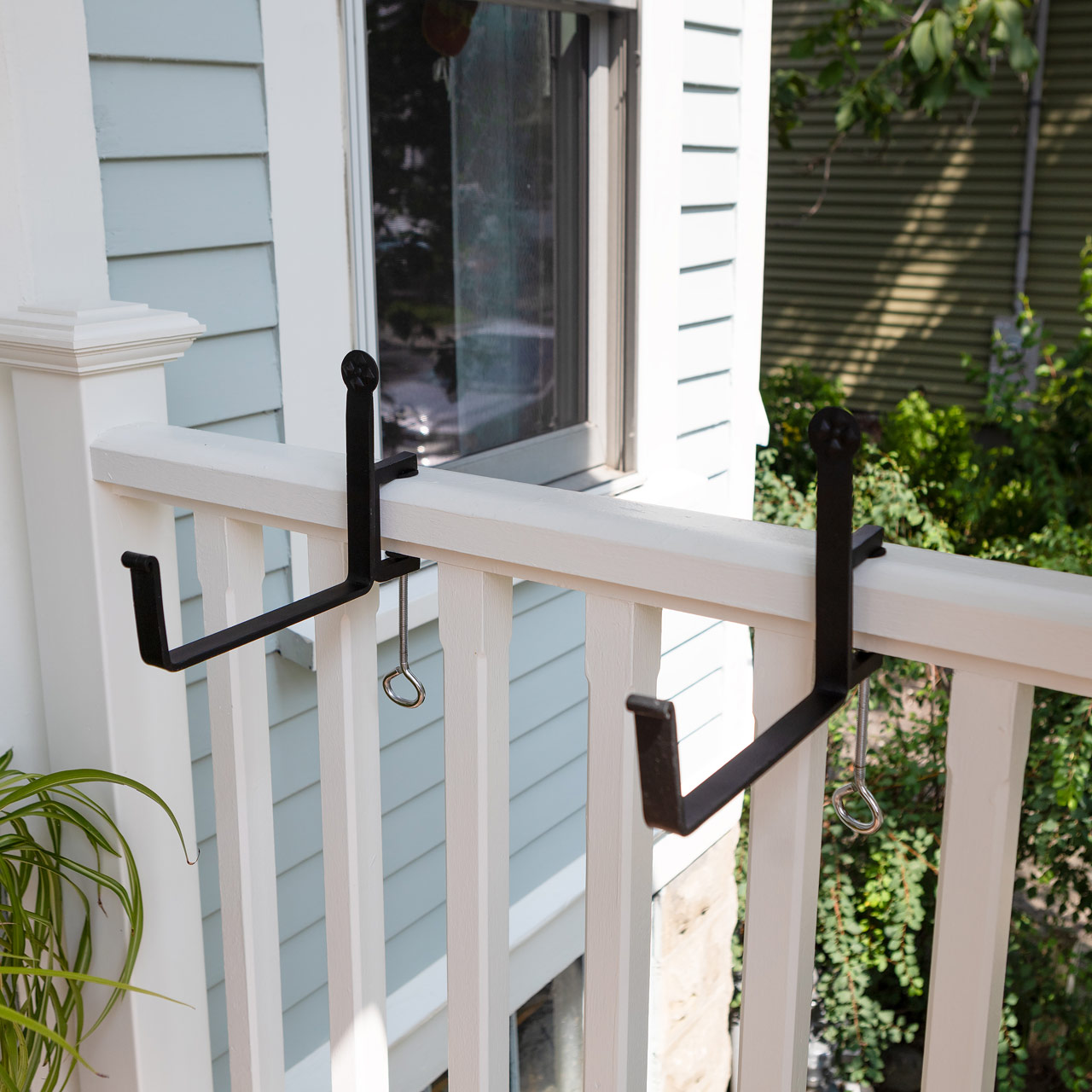 - Wrought iron Clamp-on Brackets measure 8-in D at base x 7 1/4-in H x 1 1/4-in W, and are finished with Black powder coating for maximum weather resistance