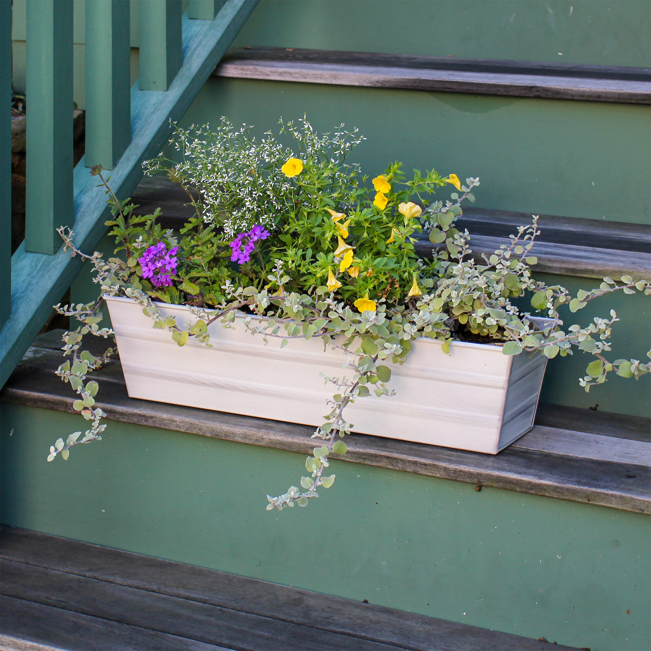 - Measures 22-in L x 6-in W x 5-in H, made of Galvanized Steel with a White Patina finish