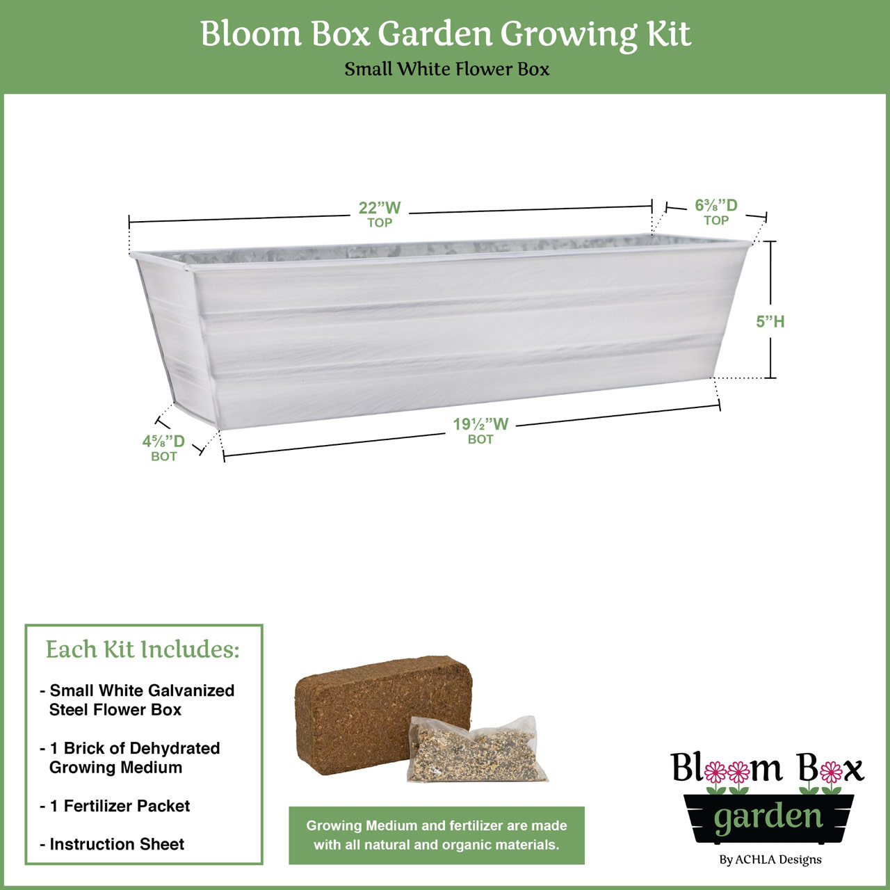 - Bloom Box Garden includes a dehydrated coir growing medium and natural time-release fertilizer to create an instant plant-ready container garden