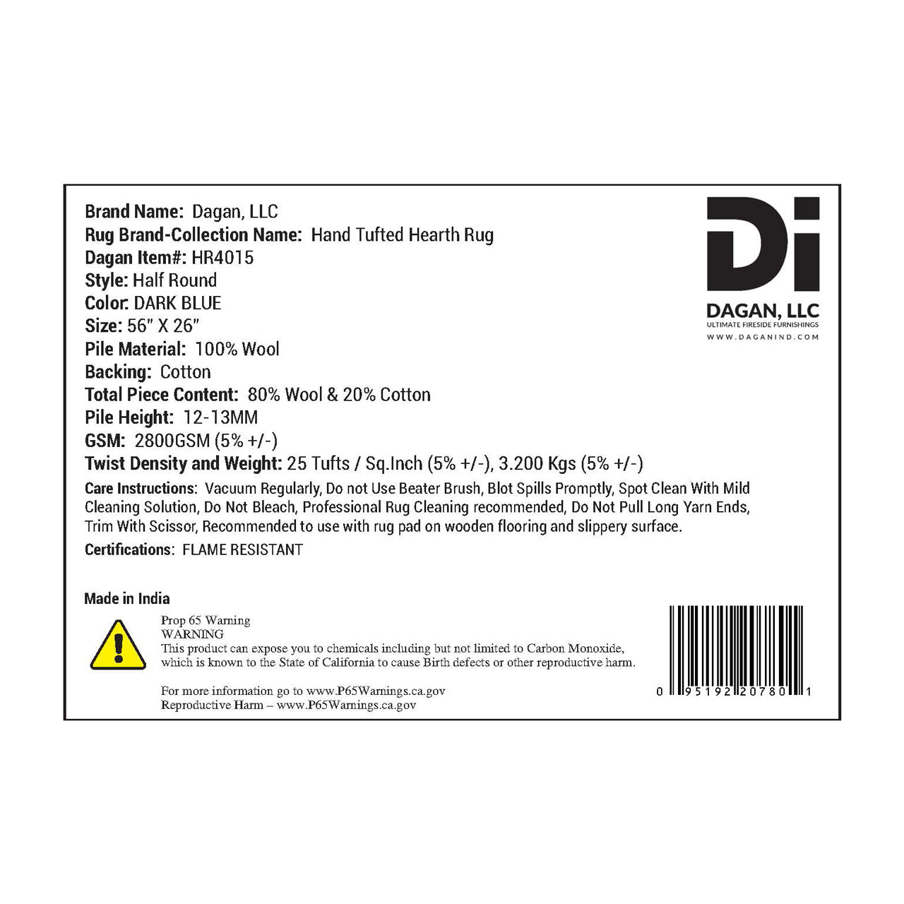 All Dagan hearth rugs meet or exceed Federal Law and CPSC standards under 16 CFR Part 1631 (FF 2-70) for surface flammability of small carpets and rugs, ensuring reliable flame resistance. Perfect for indoor use, this rug delivers trusted fire protection while enhancing the comfort and visual appeal of your fireplace space.
