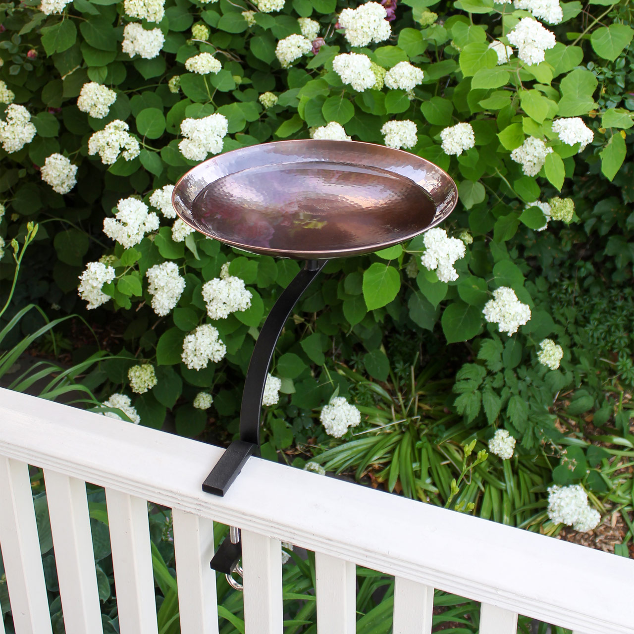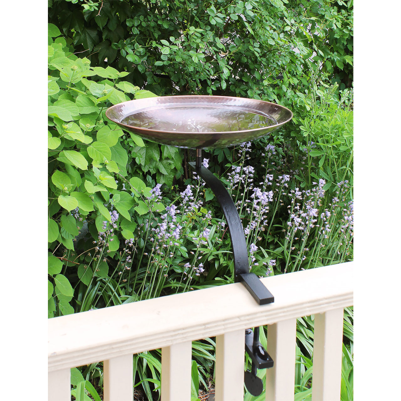 This Rail-Mounted Burnt Copper Birdbath is a simple hammered copper birdbath bowl with a handrail bracket. The shallow bowl has a round hammered or "peened" texture and an antique copper finish that will patina naturally. A threaded base on the underside of the bowl attaches the bowl to the wrought iron bracket. Perfect for birdwatching on porches, balconies or decks, the bracket has C-type clamp that holds the bracket to the railing without need for drilling or permanent mounting.
