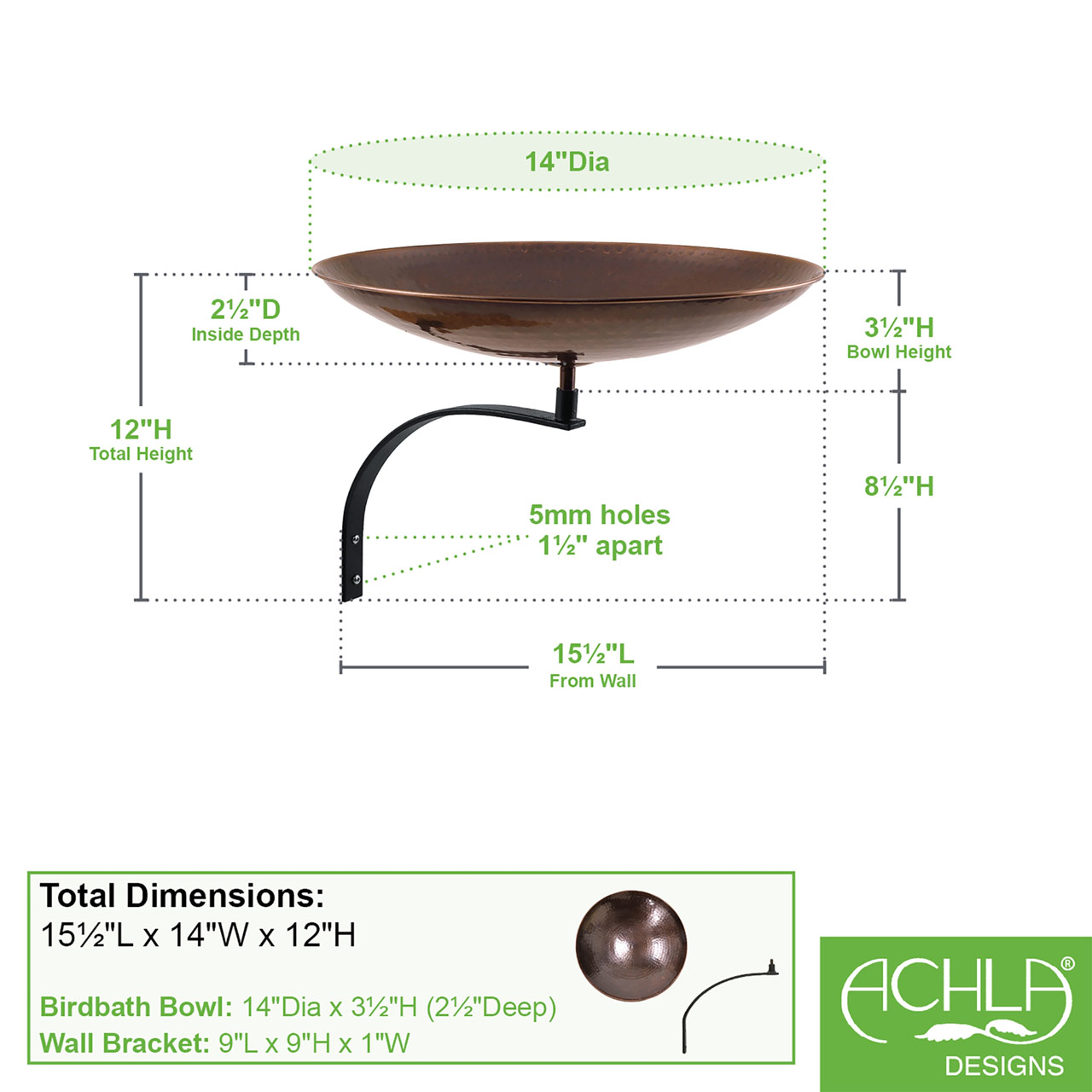 - Bowl measures 14" diameter x 2 1/2"D with a threaded base that attaches to the bracket