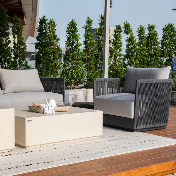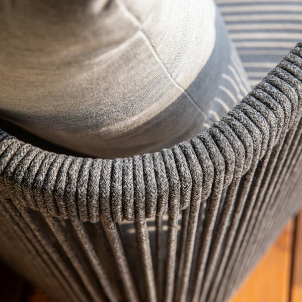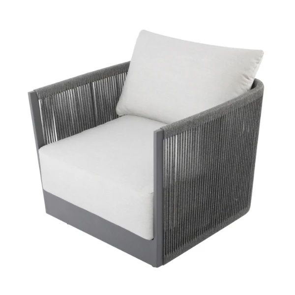 Designed with strength and style in mind, this piece features a fully welded, scratch-resistant, powder-coated heavy-duty aluminum frame in dark grey, accented with contemporary round rope weaving for a refined look. The seat and back cushions are filled with high-resiliency foam and upholstered in weather-resistant premium Sunbrella® Canvas Granite (5402) fabric, offering superior comfort, durability, and timeless appeal. Built with commercial-quality construction, it delivers long-lasting performance and elegance for outdoor living. WARNING: This product can expose you to chemicals known to the State of California to cause cancer and birth defects or other reproductive harm. For more information, visit www.P65Warnings.ca.gov.