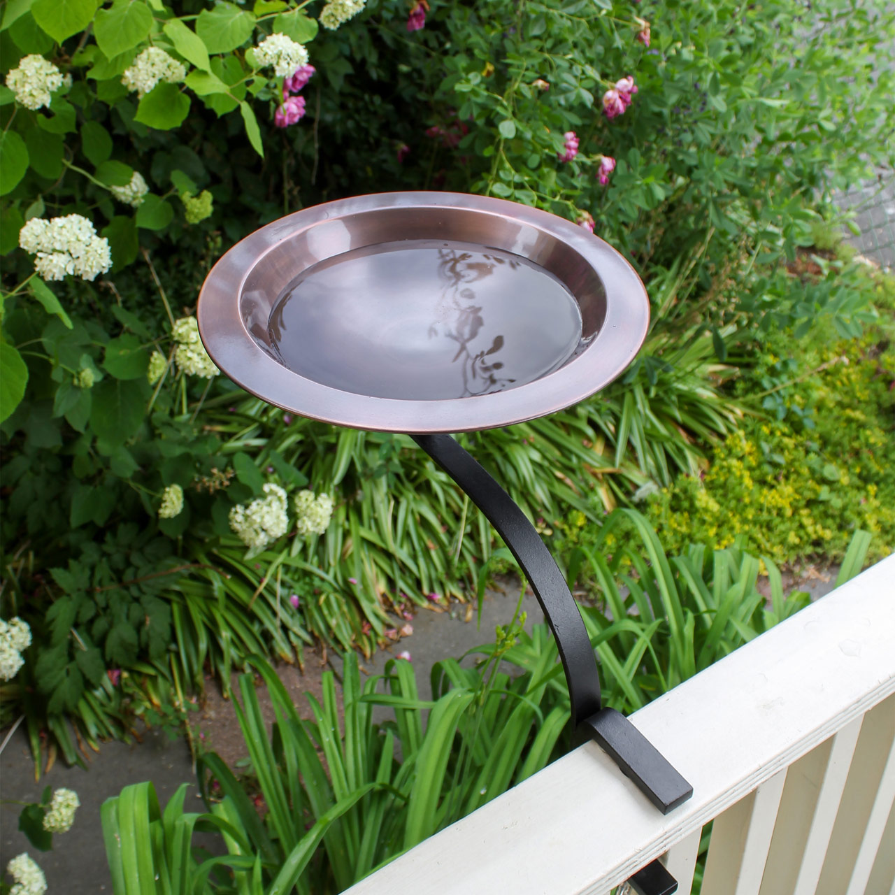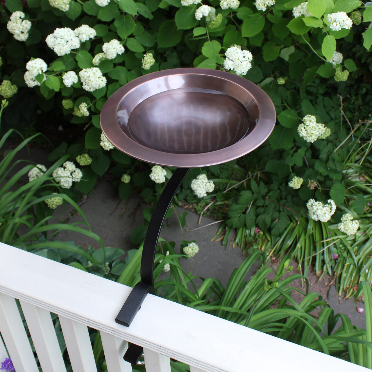 This Rail-Mounted version of our Classic Birdbath has a simple copper bowl with a wide rim for birds to perch while drinking and bathing. The threaded base on the underside of the bowl attaches to a Railing Bracket. Ideal for porches, balconies or deck rails, the wrought iron bracket has C-type clamp that holds the bracket to a deck or handrail without need for drilling or permanent mounting.