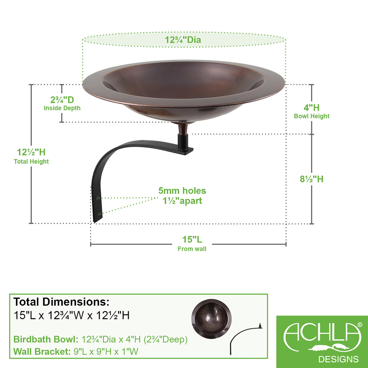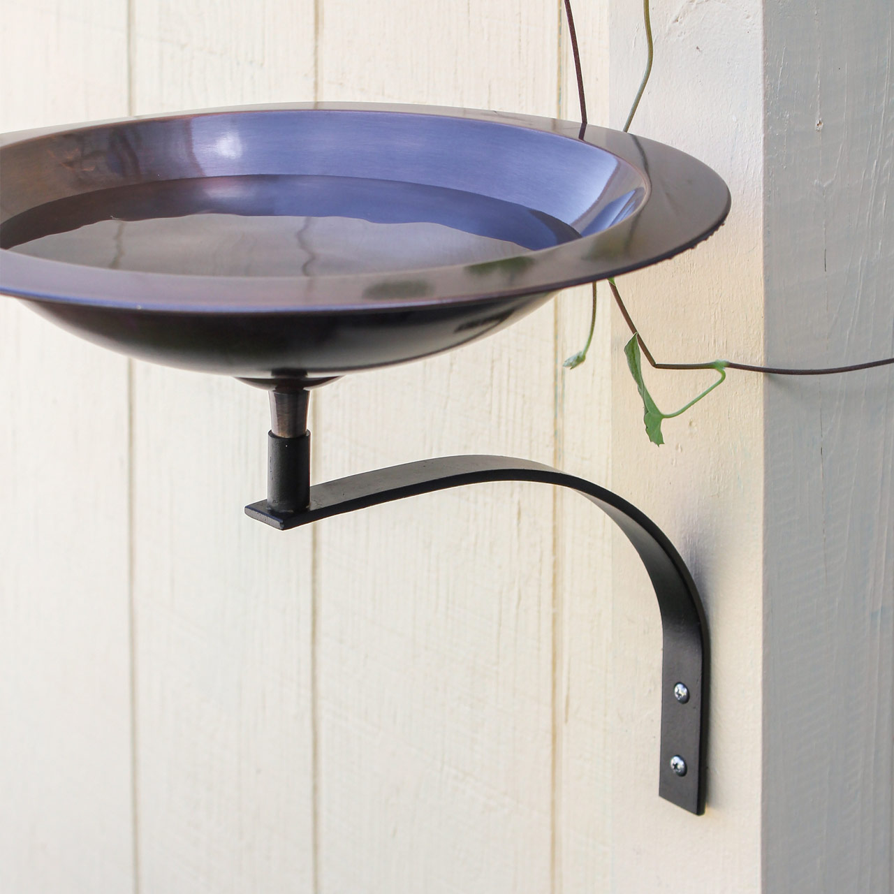 This Wall-Mounted version of our Classic Birdbath has a simple copper bowl with a wide rim for birds to perch while drinking and bathing. Ideal for porches, decks and fence posts, the bowl has a threaded base that attaches to the wrought iron Wall Bracket. Two mounting holes and hardware are provided.