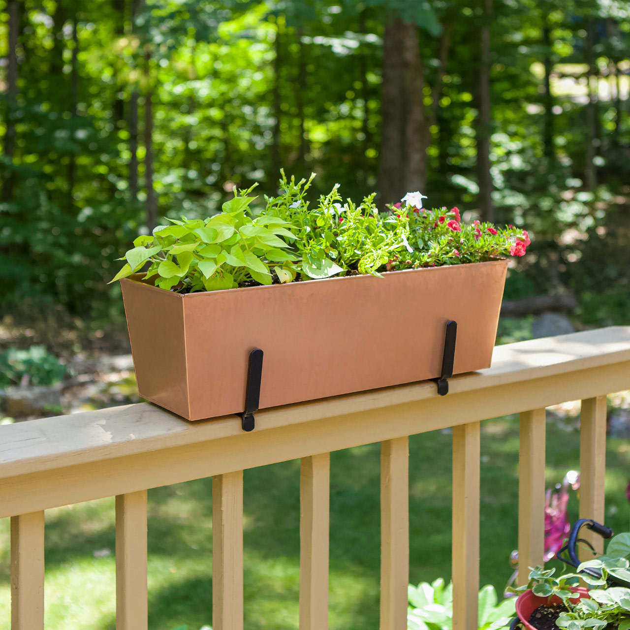 The Copper Plated Flowerboxes feature a simple rolled edge for a classic copper look, developing a natural patina over time. The included brackets are designed to securely hold flower boxes to the top of a deck or porch railing. Fasten the brackets down to the rail at your preferred distance apart and boxes are captured within the U-shaped holder. In two widths to fit standard 4 and 6 inch railings.