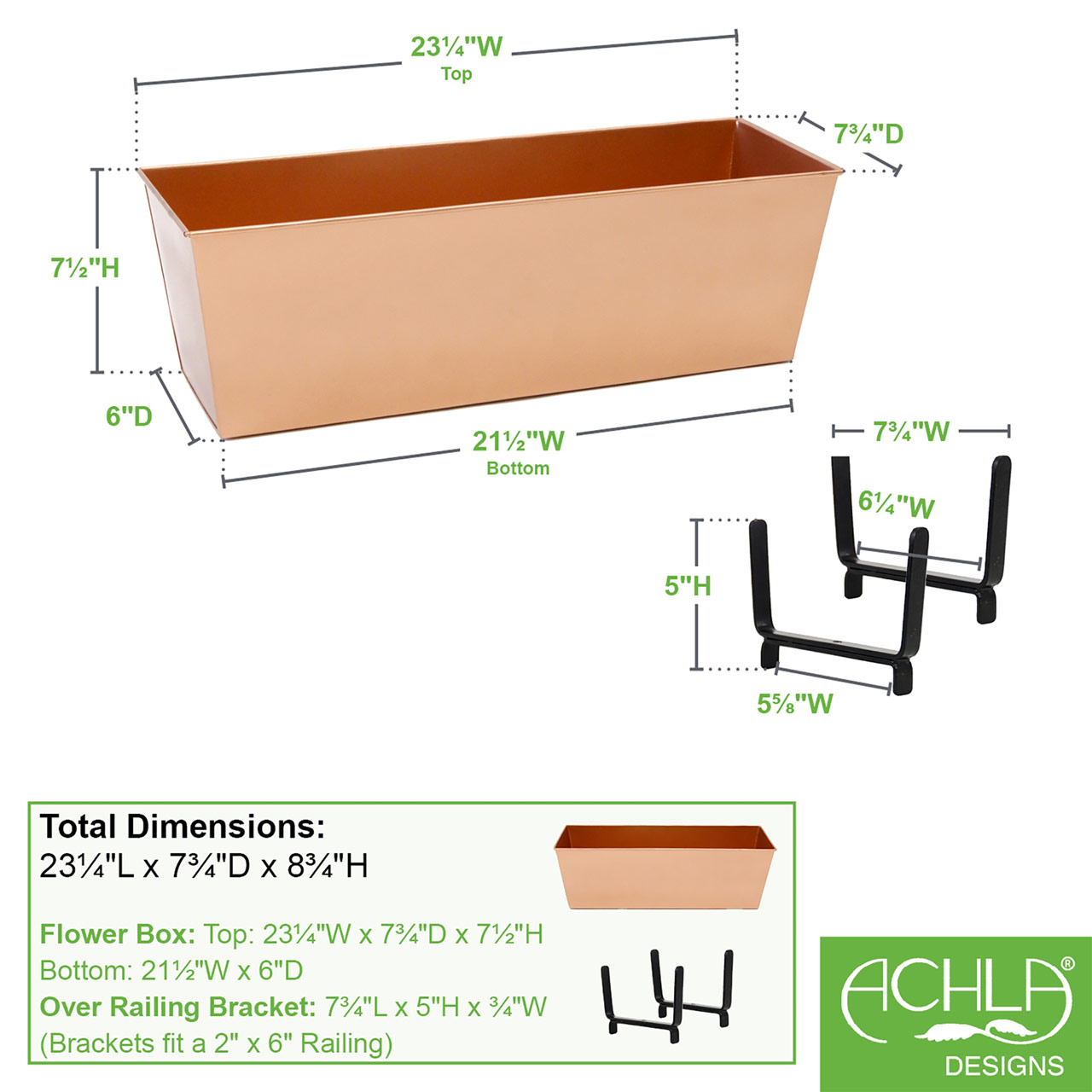 - Flower Box is made from Galvanized Steel with a Copper Plated Antique Finish that will develop a rustic natural patina over time, measures 23 1/2-in L x 7 3/4-in W x 7 1/2-in H