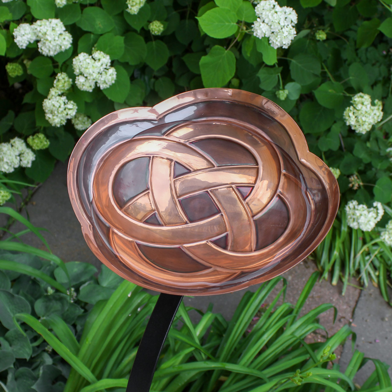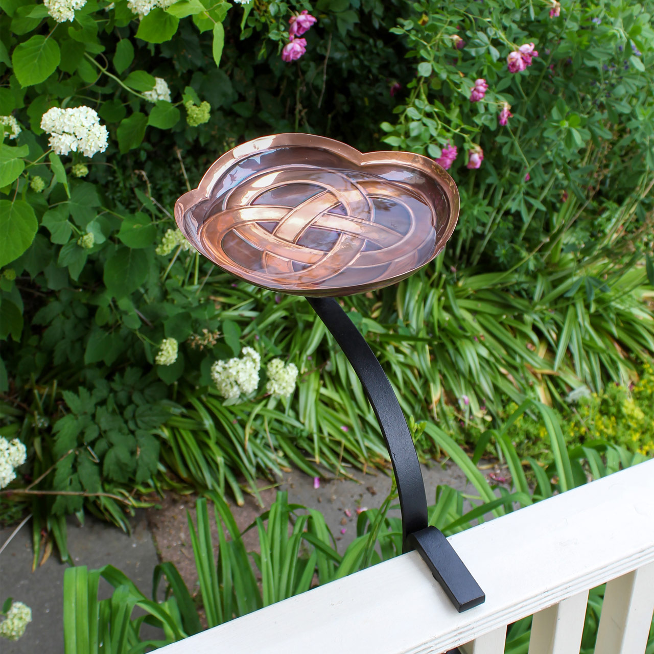 A Celtic love knot design is embossed inside the scalloped bowl of The Dara Knot Birdbath with Railing Bracket. The threaded base on the underside of the bowl attaches the bowl to the clamp-on wrought iron bracket. Perfect for birdwatching on porches, balconies or decks, the bracket has C-type clamp that holds the bracket to the railing without need for drilling or permanent mounting. Ideal for your bird-loving or gardening sweetheart, this birdbath makes a perfect copper anniversary gift.