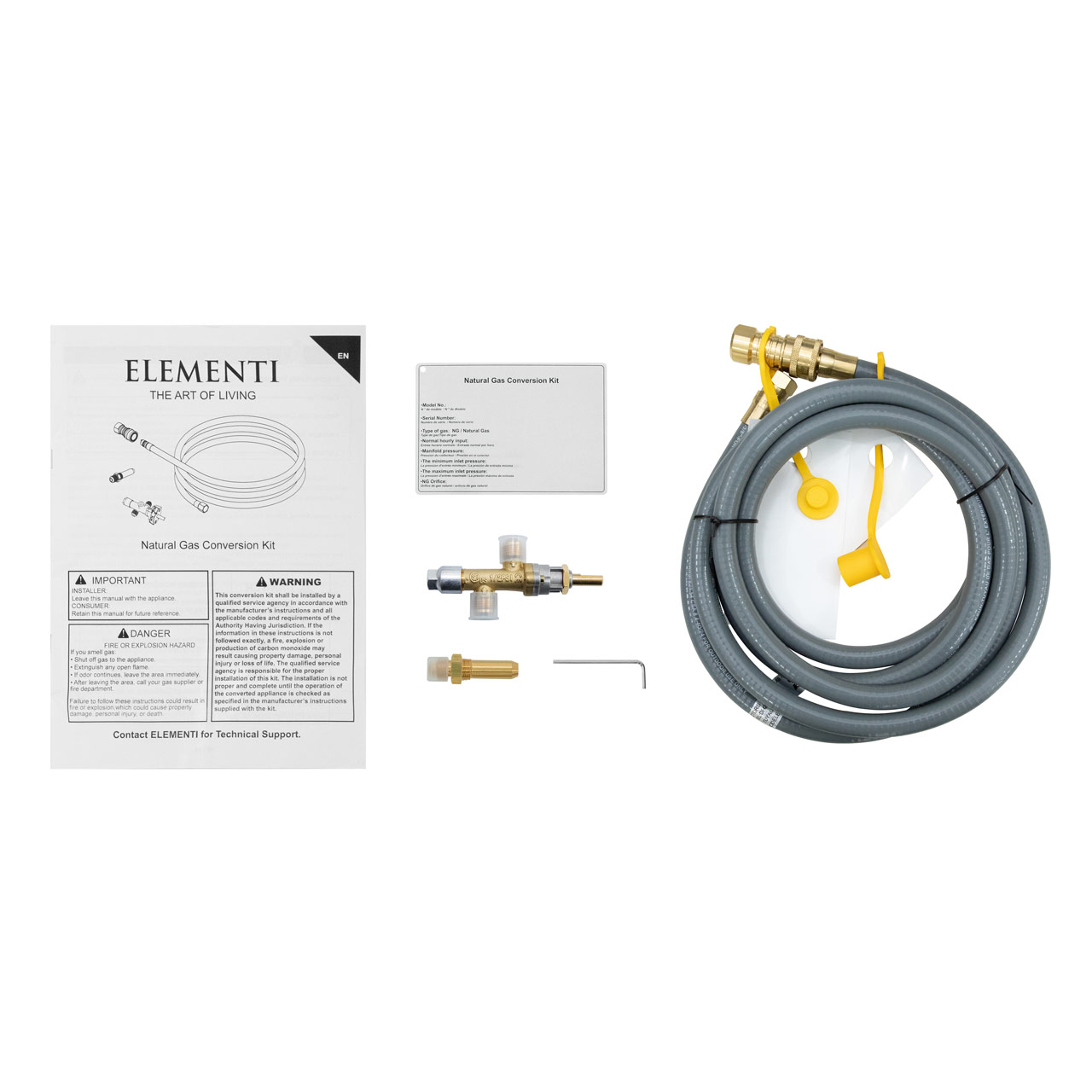 The Elementi 45,000 BTU Natural Gas Conversion Kit is designed for use with OFG101, OFG103, OFG104, OFG105, OFG110, OFG121, OFG139, OFG145, and OFG147 fire tables, providing all the necessary components to easily transition from propane to natural gas, ensuring consistent warmth and reliable performance season after season. Includes a brass orifice, component fitting, and a 10 ft gas hose. WARNING: This product can expose you to chemicals known to the State of California to cause cancer and birth defects or other reproductive harm. For more information, visit www.P65Warnings.ca.gov.