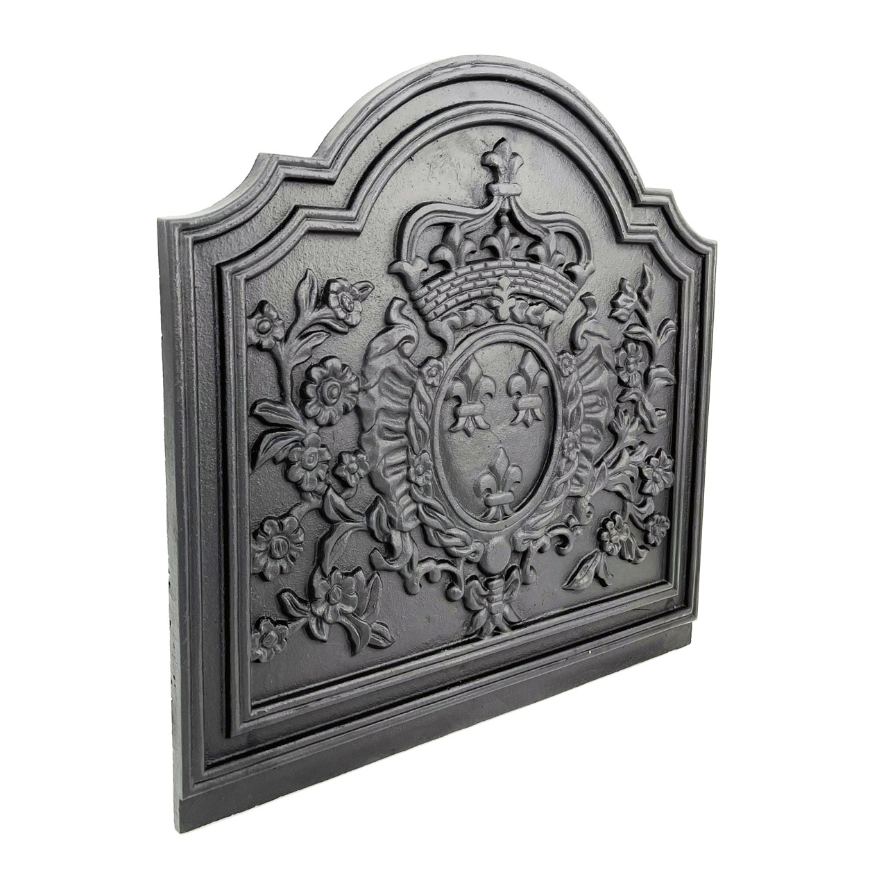 The Dagan Black Cast Iron Crown Medallion Fireback, 19.5 x 19.5 inches, brings both elegance and improved performance to your fireplace. Featuring a detailed crown medallion design, this fireback enhances the look of your hearth while helping boost heating efficiency. Crafted from durable cast iron with a black finish, it is built to withstand years of use. Placed at the back of your fireplace, it reflects heat back into your home instead of allowing warmth to escape up the chimney. Fireback only; feet sold separately.