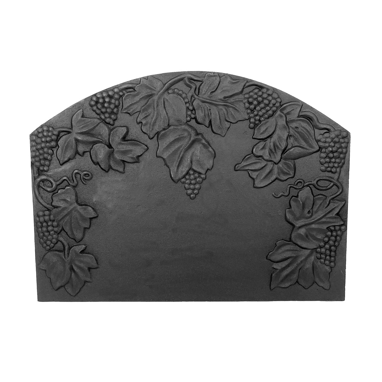 The Dagan Black Cast Iron Grape Fireback, 26.75 x 19.5 inches, combines style and function for your fireplace. Featuring a detailed grape leaf design, this fireback not only enhances your hearth décor but also improves heating efficiency by reflecting warmth back into your home. Made from durable black cast iron, it is built to last for years of use. Simply place it at the back of your fireplace to maximize heat retention. Fireback only; feet sold separately.