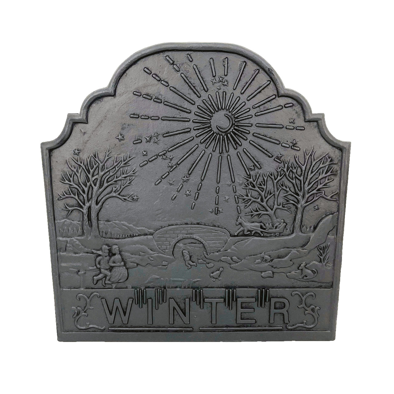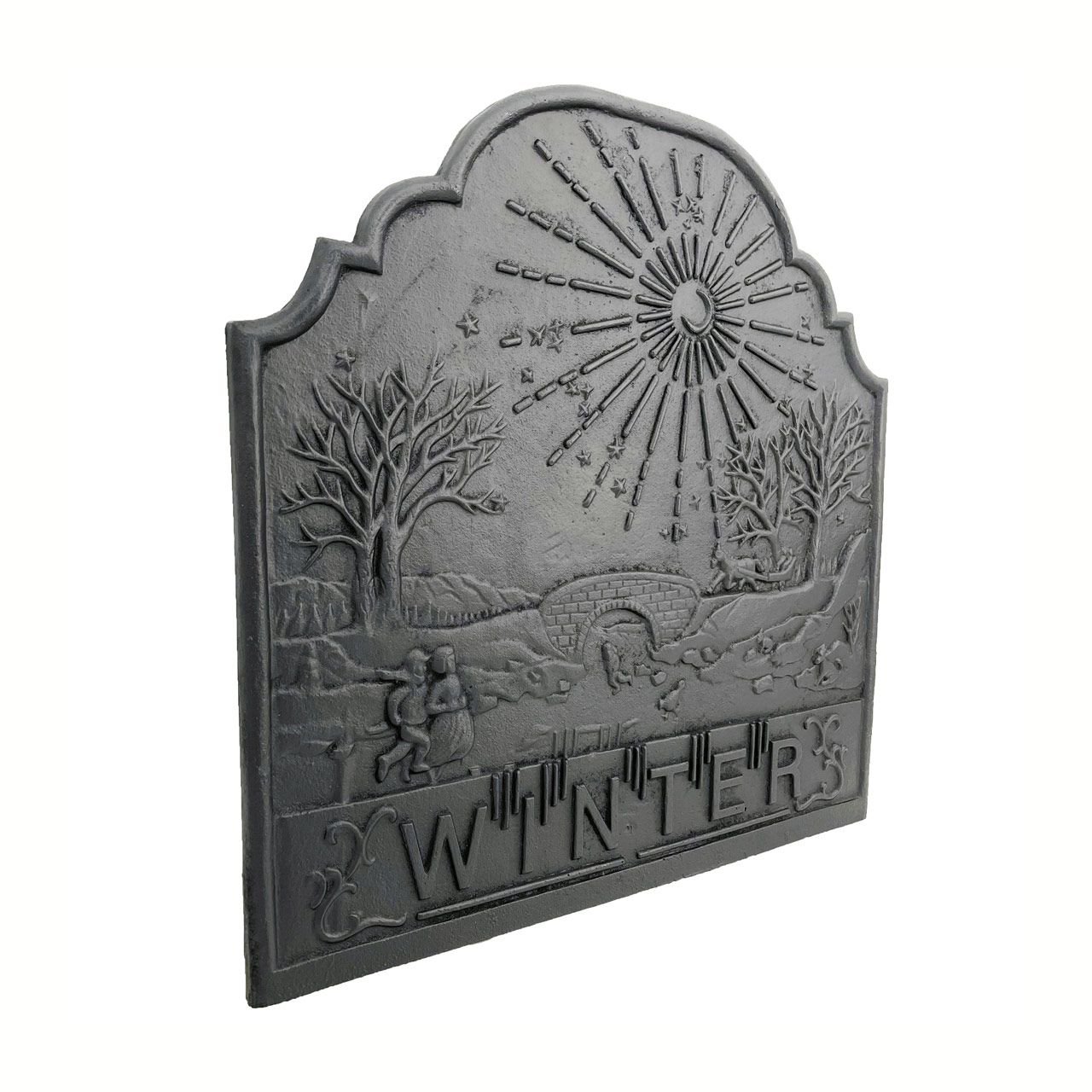 The Dagan Black Cast Iron Winter Fireback, 20.75x20.75 inches, adds both beauty and efficiency to your fireplace. Featuring an intricate Winter-themed design, this decorative fireback enhances your hearth while helping improve heat output. Crafted from durable black cast iron, it reflects warmth back into your home rather than allowing it to escape up the chimney. Built to last, this fireback is a practical and elegant upgrade for any traditional fireplace. Fireback only; feet sold separately.