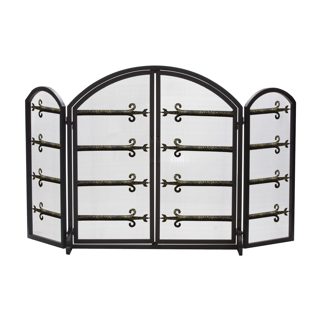Enhance your fireplace with the Dagan Three Fold Black and Antique Gold Arched Fireplace Screen with Doors, 54x32 inches. Crafted from durable wrought iron, this elegant three-panel arched screen features a striking antique gold sword design that adds a touch of sophistication to any hearth. The front doors open easily for convenient access to your fireplace, while the sturdy frame protects your living space from sparks and embers. Measuring 32 x 54 inches (H x W) and weighing 14 pounds, it combines beauty and functionality in one premium fireplace accessory.