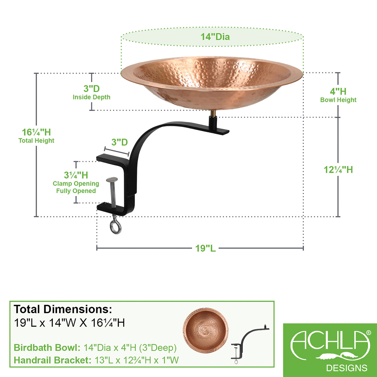 This simple Rail-Mounted 14" Hammered Solid Copper Birdbath bowl is a classic garden accent. The wide rim lets birds perch while drinking and bathing for close observation. Perfect for porches, balconies or deck rails, the wrought iron bracket has C-type clamp that holds the bracket to the railing without need for drilling or permanent mounting. Solid copper will never rust outdoors and will instead develop a lovely natural patina over time. Ideal for your bird-loving or gardening sweetheart, this birdbath makes a perfect copper anniversary gift.