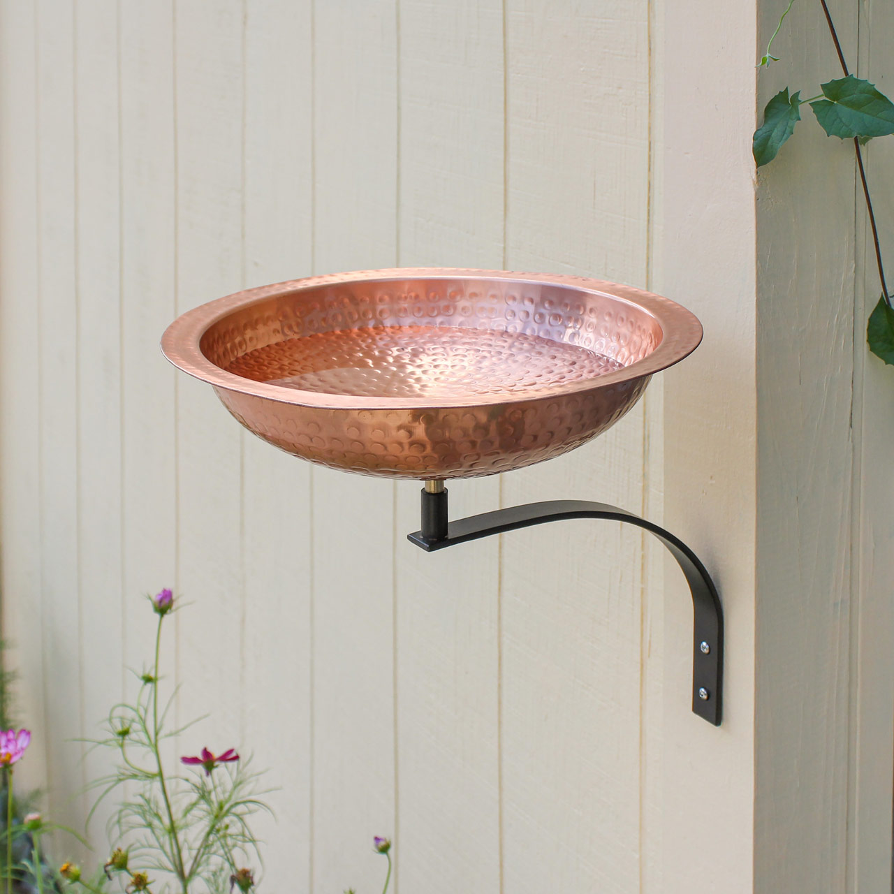 This simple Wall-Mounted Hammered Solid Copper Birdbath bowl has a classic style with a wide perching rim with a wide perching rim for close observation of wildlife in your backyard habitat. Wall-mounted, this birdbath is perfect for porches, balconies or deck posts. The wrought iron bracket has two mounting holes and a stud that holds the birdbath.