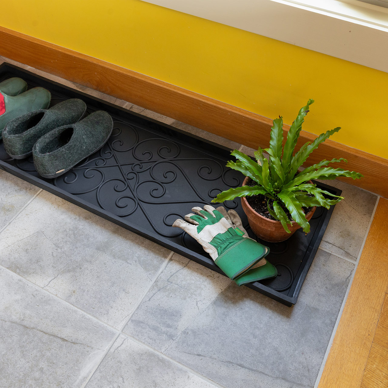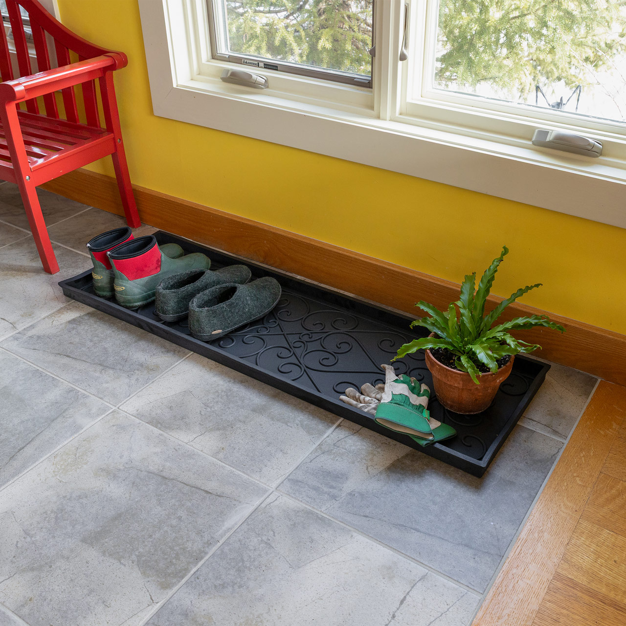 - Multi-Purpose Area Tray: Whether you need a tray for your winter boots, a trunk mat for transporting your garden accessories, or a stomp pad for your mudroom, this shoe tray can do it all. Classy enough for indoor use and practical enough for outdoors and gardening, this rubber boot mat catches water, snow, and mud so you can keep your home, SUV, or work area clean.