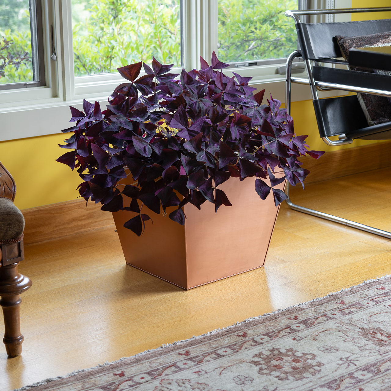 Ideal for small ornamentals, citrus trees, large-leafed tropicals, sculptural cacti, this tall Square Copper Flower Box is a light and durable modern planter with a minimalist tapered form. Made of galvanized steel with a brushed copper plated finish this flowerbox can be used as a cachepot, or direct planted, for use indoors and out. The Square Copper Flower Box will develop warm natural patina over time outdoors that is a perfect complement to green foliage. Used alone, or with one of our Solaria Collection of stands, this planter will complement any midcentury or modern plant room or garden style.
