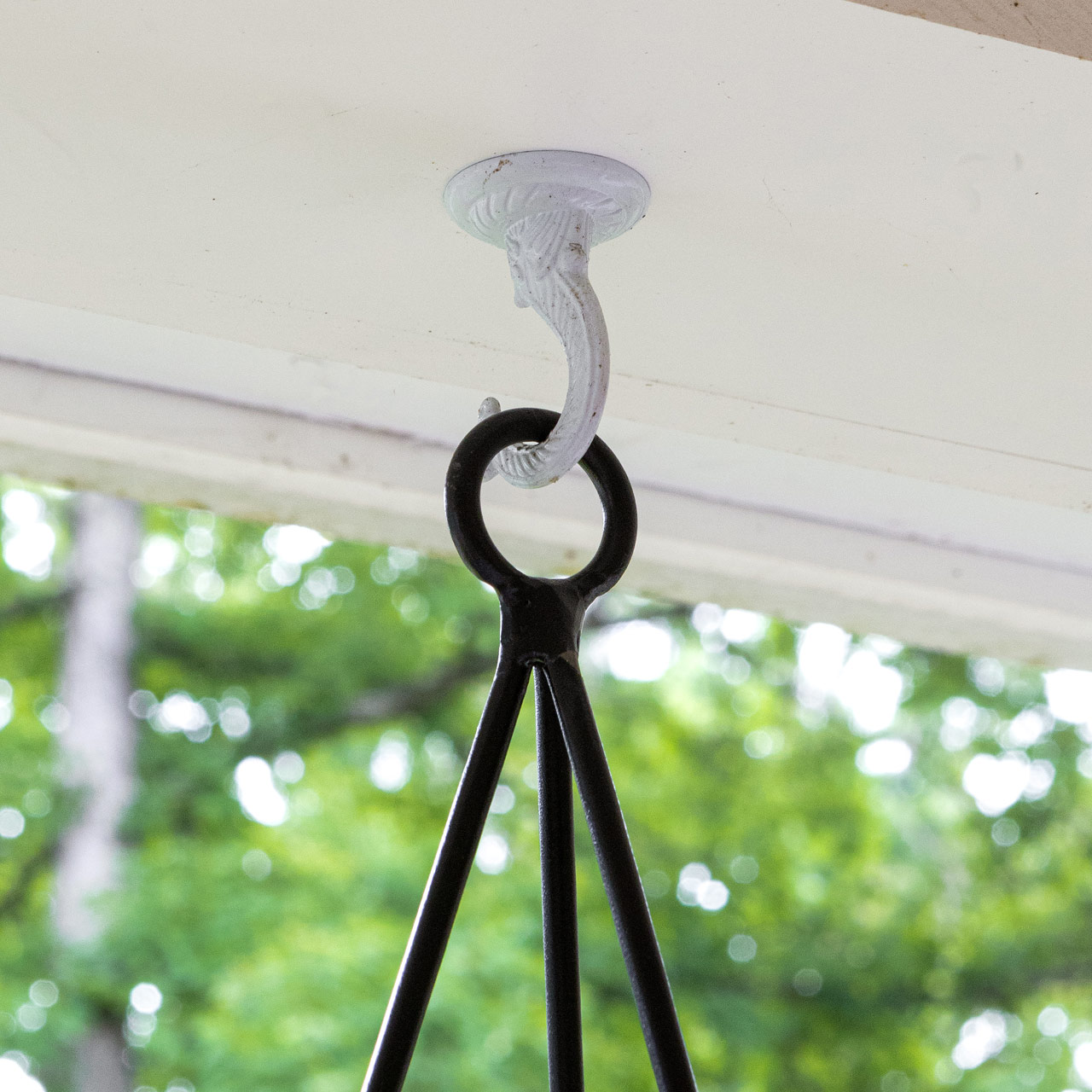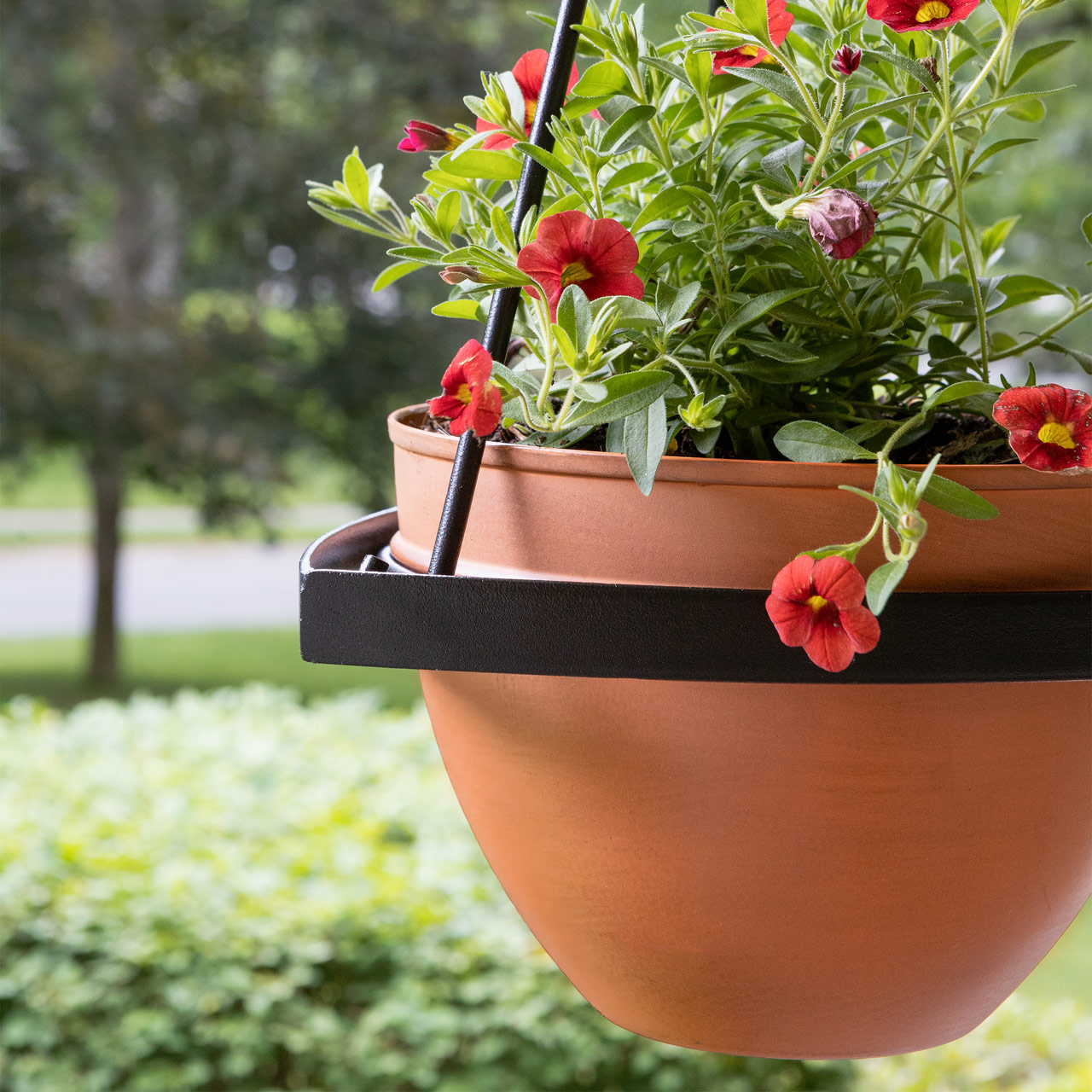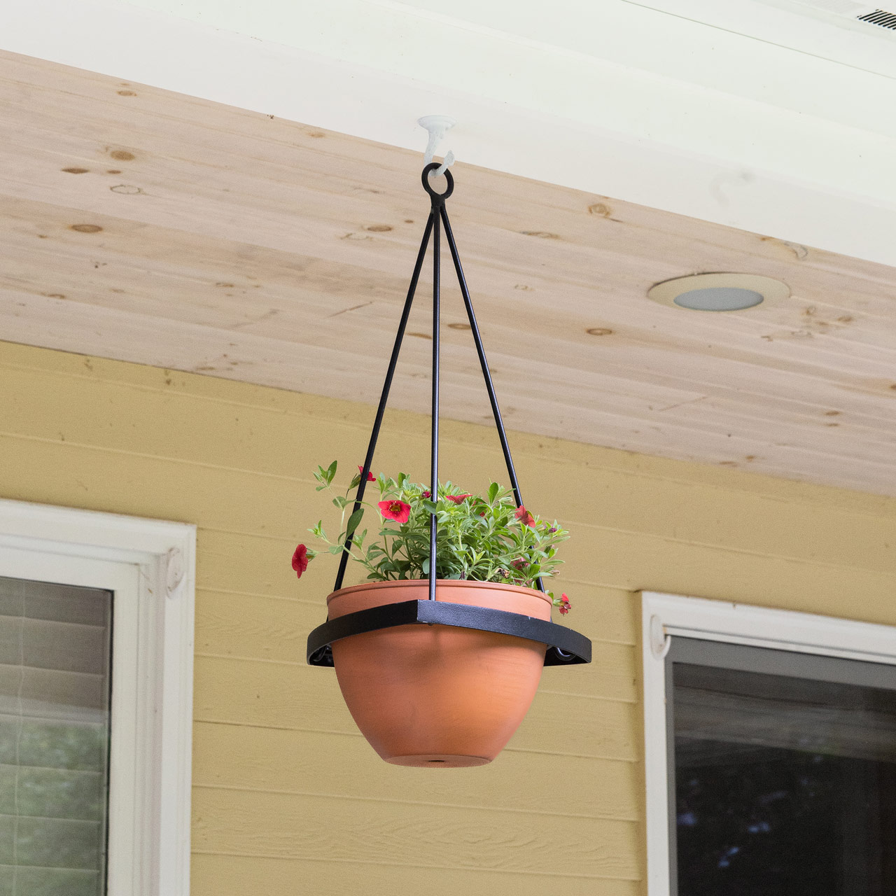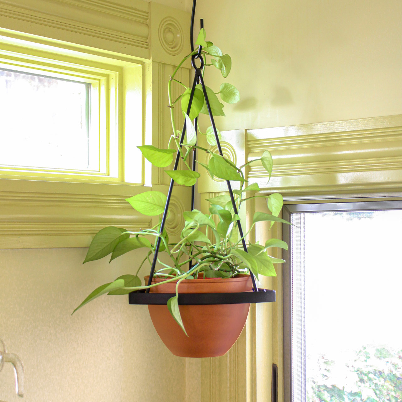 The Lina Planter is a contemporary style plant hanger for the modern home or container garden, with attractive minimalist design that is simple and practical in its ease of use. Slip the ring around the planter from beneath, hook the end of each rod into the corner loop and hang from the o-hook at the top. Wrought iron plant hangers are available in two sizes, with or without terra cotta patina galvanized steel pots, and a black powder coated finish for maximum weather resistance. Small Lina Planter pot is 8-in diameter, Large Lina Planter pot is 11 ¾-in diameter.