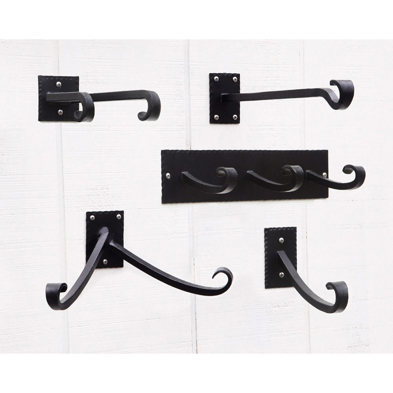 - Hand-forged from wrought iron, these sturdy wall brackets are made from square stock with soft curving hooks. Suitable for indoor and outdoor use, they have a black powder coated finish.
