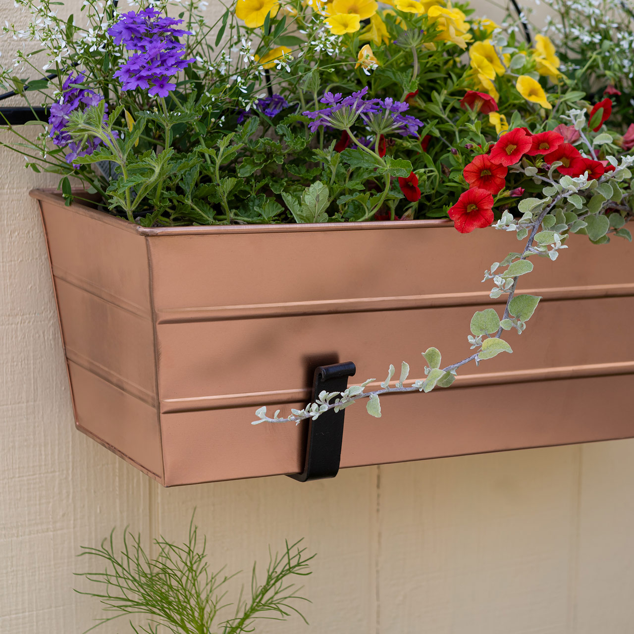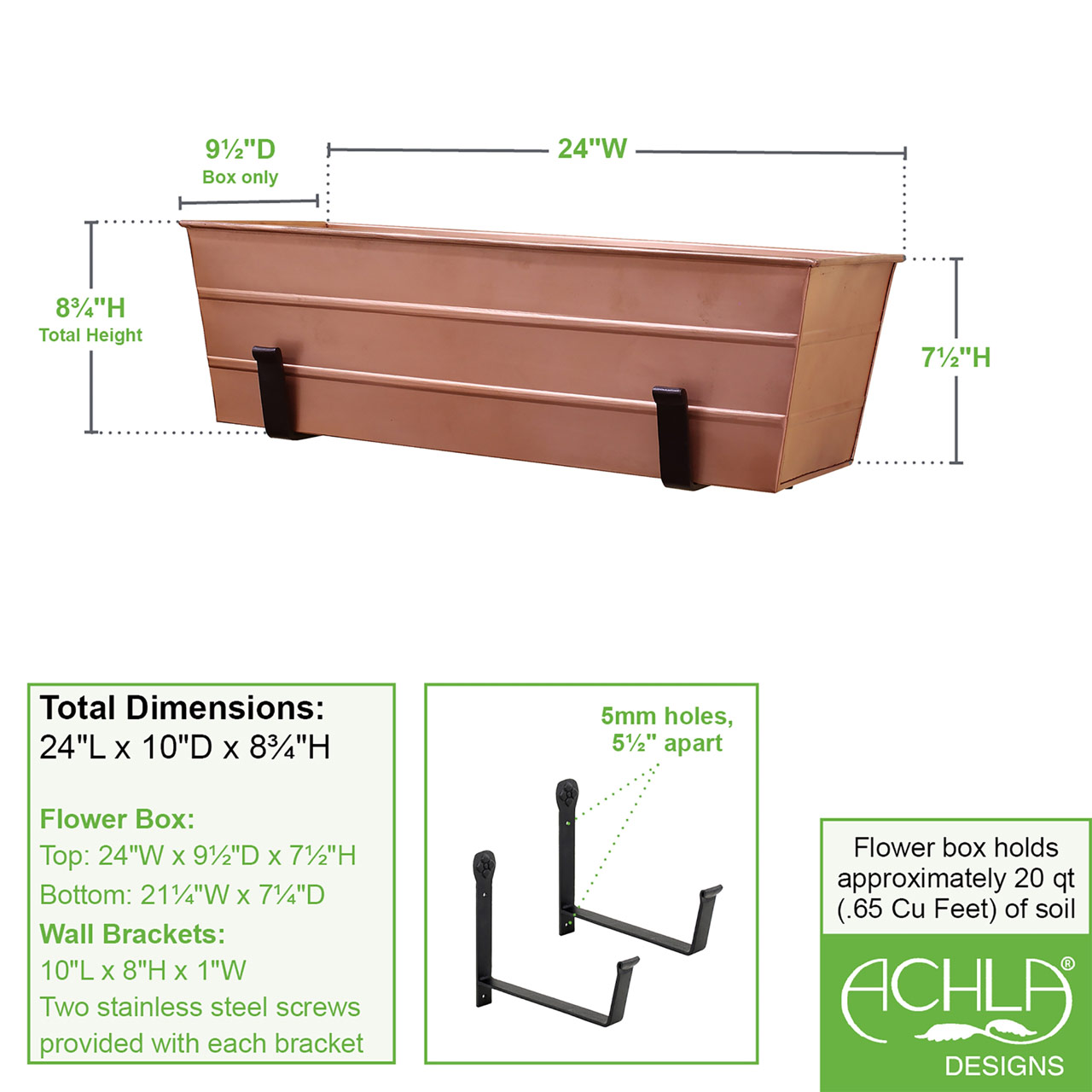 - Medium Copper Flower Box measures 24-in L x 7 1/2-in H, made of galvanized steel with a copper plated finish, will develop a natural copper patina over time