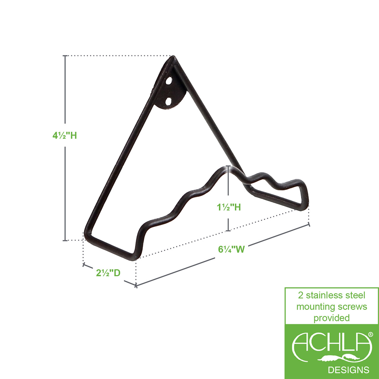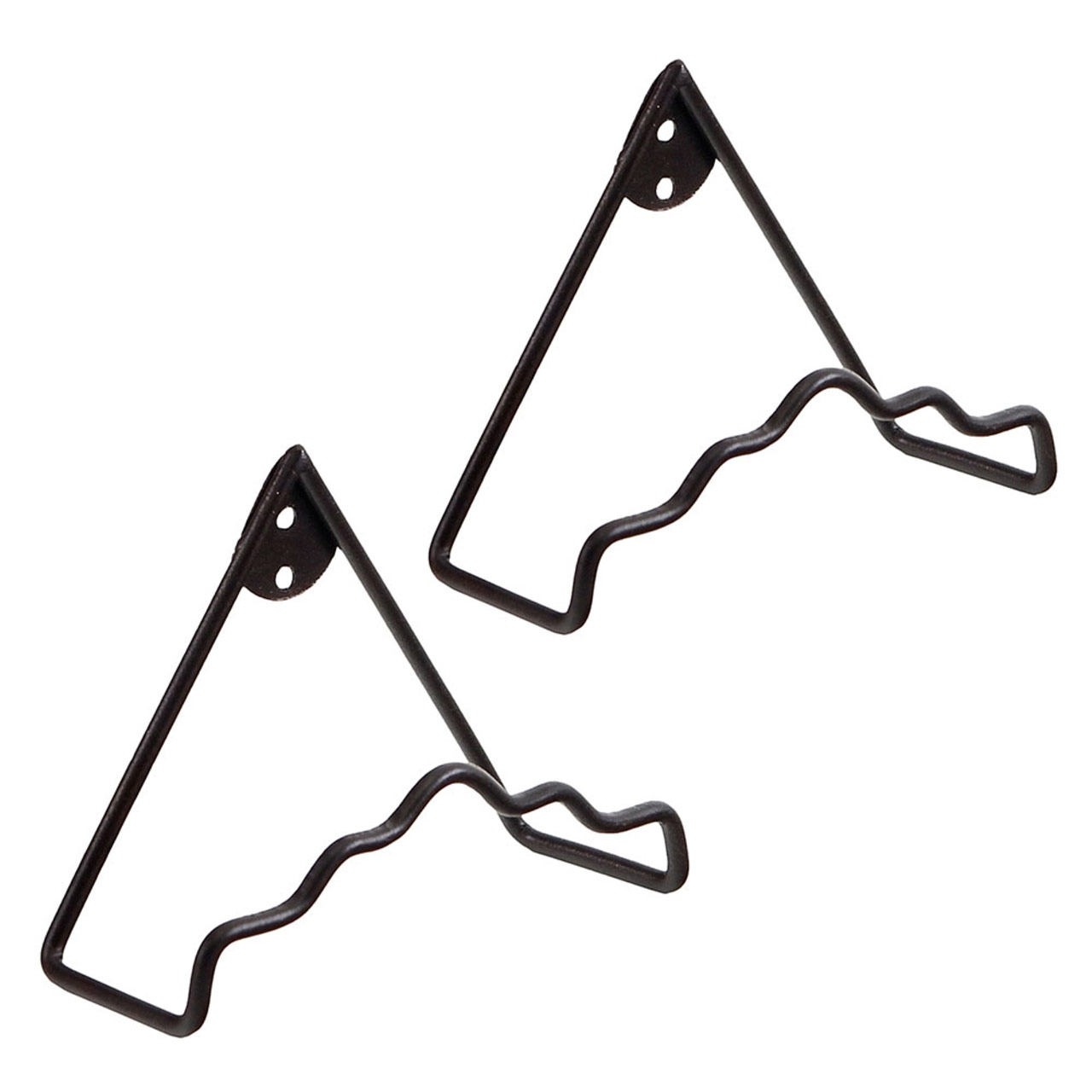 Use these wall-mounted Plate Wall Hangers to keep treasured items on display for viewing, yet hanging securely and safe from breakage. Plate hangers are a single piece display bracket, easily wall-mounted, with two holes and courtesy stainless steel screws provided. These simple hangers can accommodate a wide variety of diameters, rectangular pieces, oval, even odd shapes. Display your favorite pottery, fine China, decorative trays, art tiles, souvenir plates, even bowls. The simple attractive design will complement your artwork. Our plate display brackets are made of wrought iron with a Roman Bronze powder coated finish and sold in a pack of two.