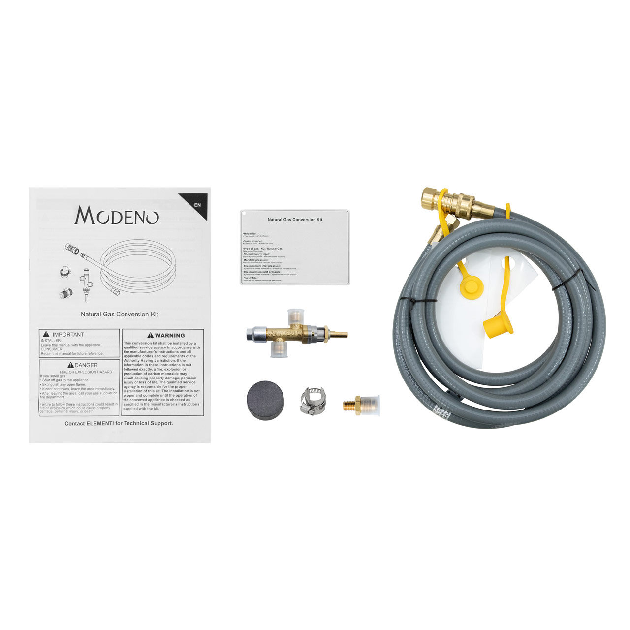 The Modeno 50,000 BTU Natural Gas Conversion Kit is built for use with OFG107, OFG113, OFG114, OFG132, OFG135, and OFG146 fire tables, including all the essential parts to convert from propane to natural gas with ease, delivering powerful heat and dependable performance for endless outdoor enjoyment. Includes a brass orifice, component fitting, and a 10 ft gas hose. WARNING: This product can expose you to chemicals known to the State of California to cause cancer and birth defects or other reproductive harm. For more information, visit www.P65Warnings.ca.gov.