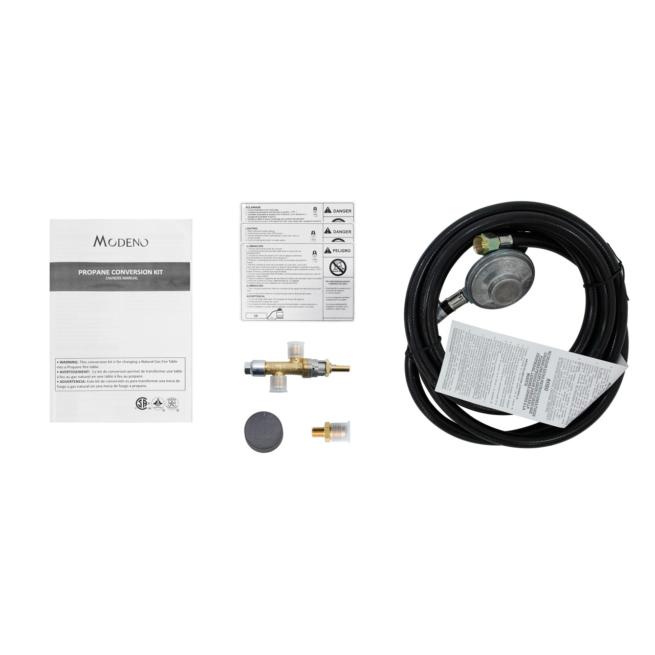 The Modeno 50,000 BTU Propane Conversion Kit is built for use with OFG107, OFG113, OFG114, OFG132, OFG135, and OFG146 fire tables, and includes a brass orifice, component fitting, and a 10 ft gas hose—providing all the essential parts to easily convert from natural gas to propane for strong, consistent heat and dependable outdoor enjoyment. WARNING: This product can expose you to chemicals known to the State of California to cause cancer and birth defects or other reproductive harm. For more information, visit www.P65Warnings.ca.gov.