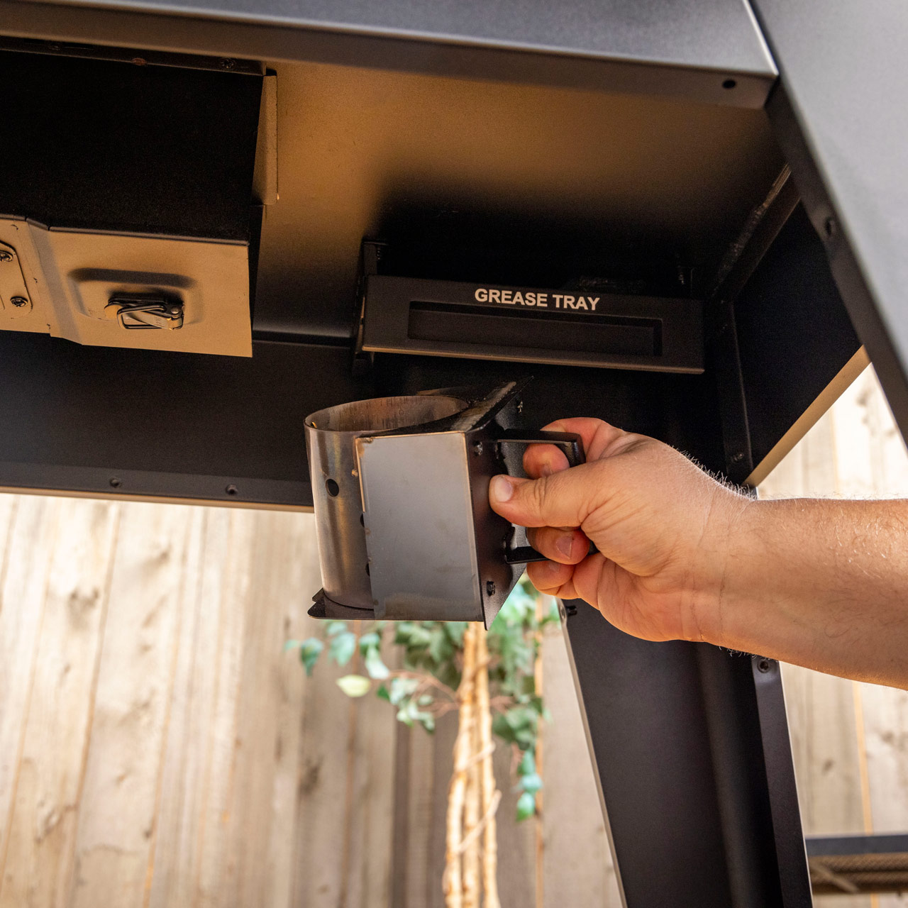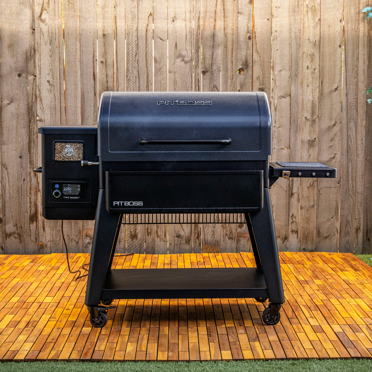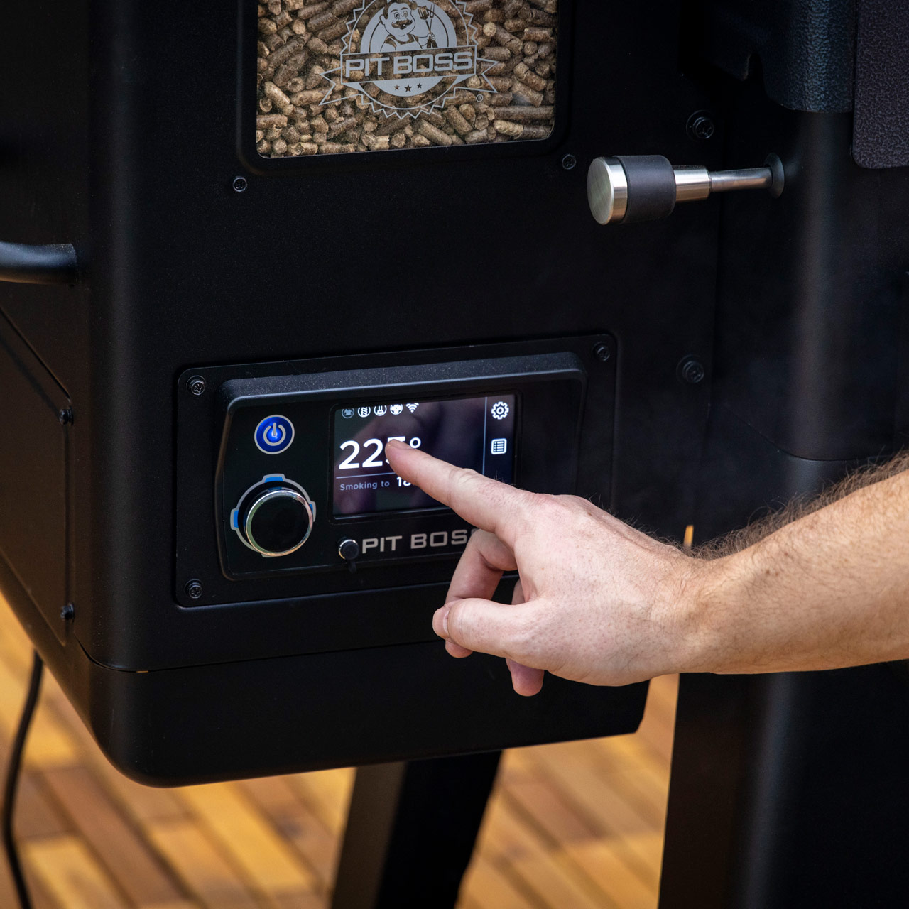 The Pit Boss Navigator PB1600M is a wood pellet grilling powerhouse with 1,593 sq. in. of cooking space, three porcelain-coated racks, and a 30 lb. hopper with improved cleanout. Fueled by 100% hardwood pellets and controlled via a Wi-Fi + Bluetooth touchscreen board, it offers precise 5°F increment settings and remote control through the Pit Boss app. It sears up to 1,000°F with the Flame Broiler™ Lever, features a rapid igniter, fan-forced convection, and easy ash and grease management systems. Ergonomic design elements include tall tapered legs, a roll top lid, and a full prep station with shelves, tool hooks, a removable cutting board, and even a bottle opener. Two meat probes are included, and the entire setup measures 65"L x 32"W x 49"H, weighing 205 lbs. assembled.