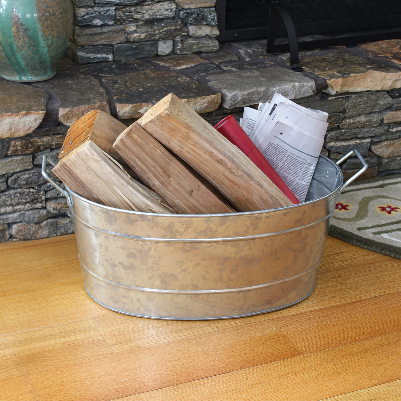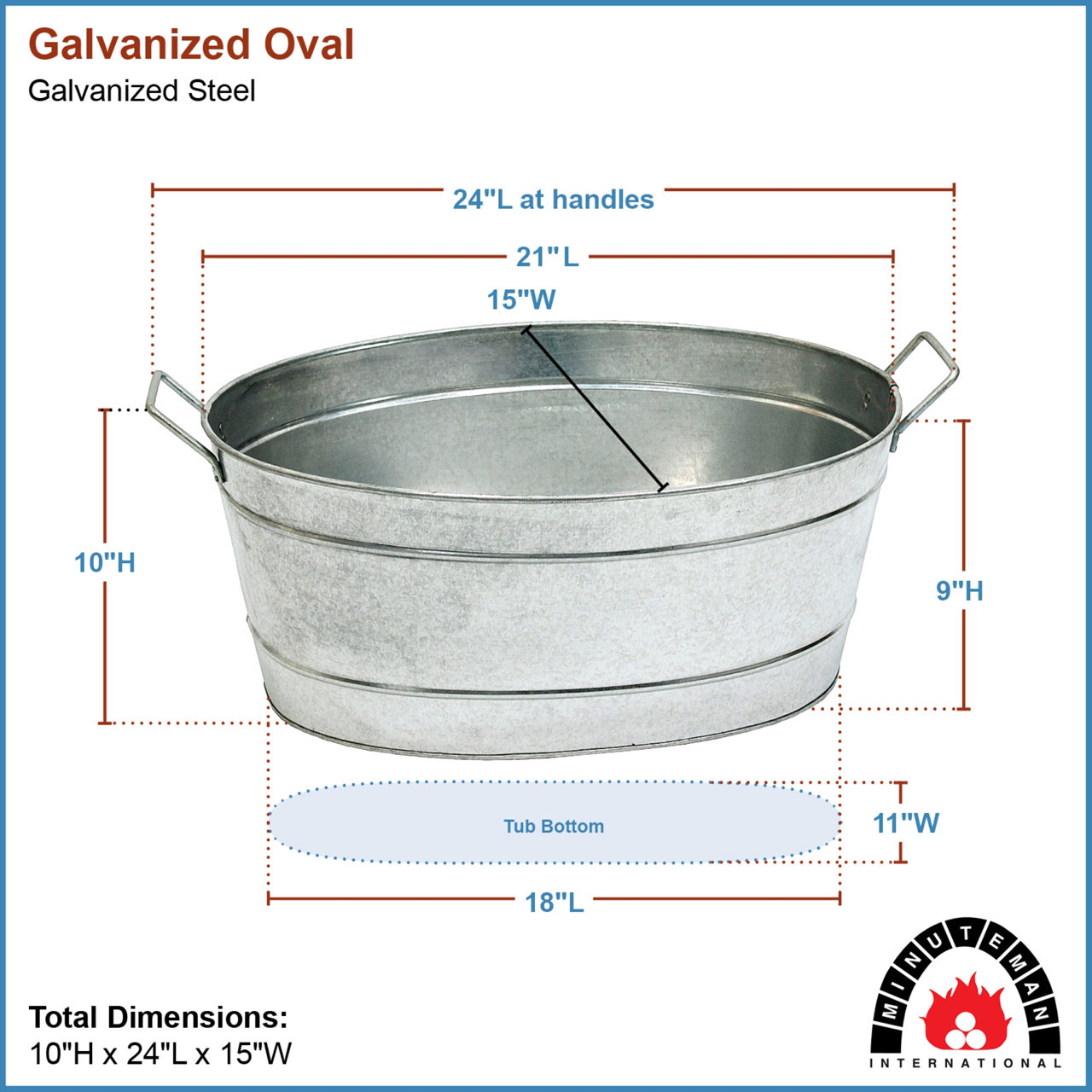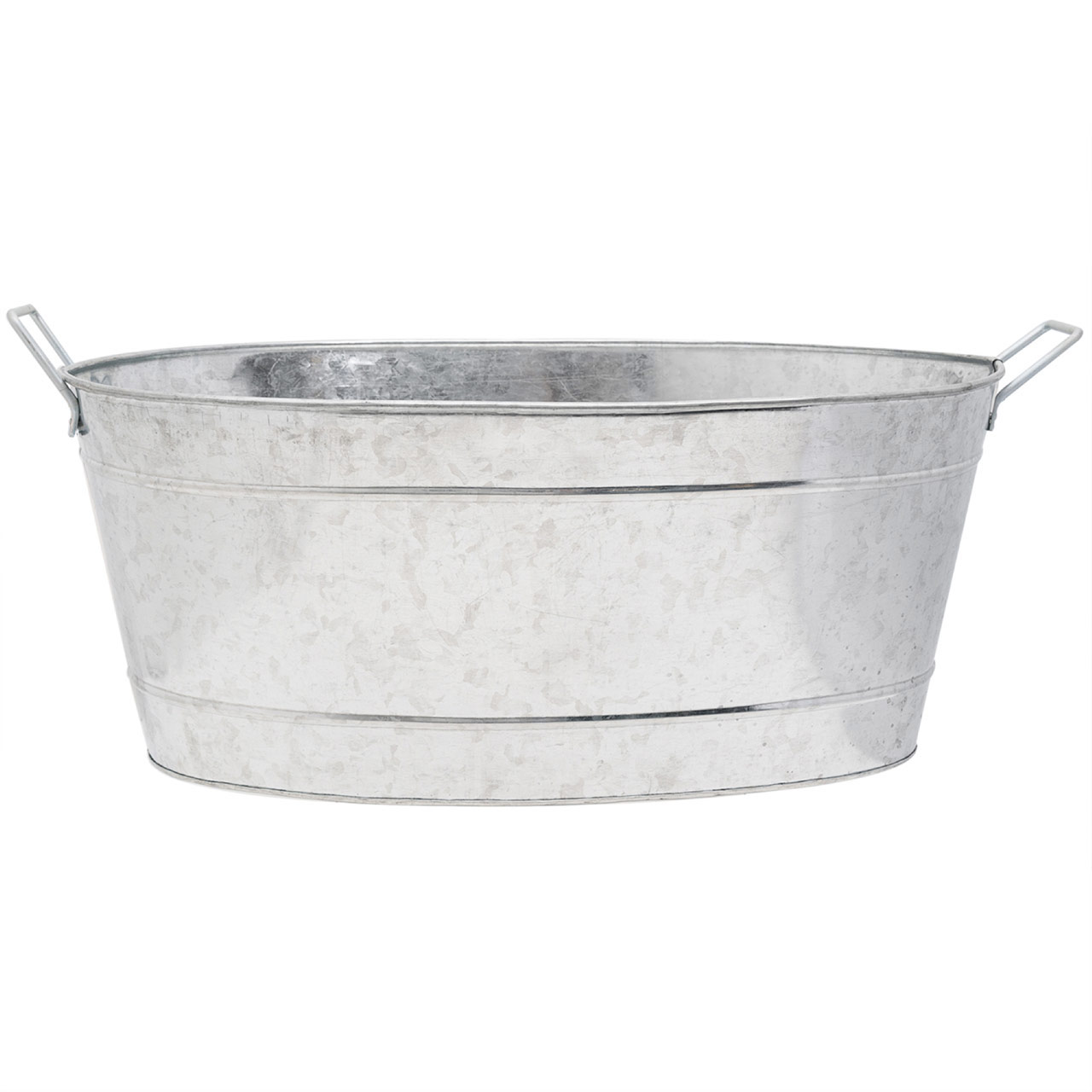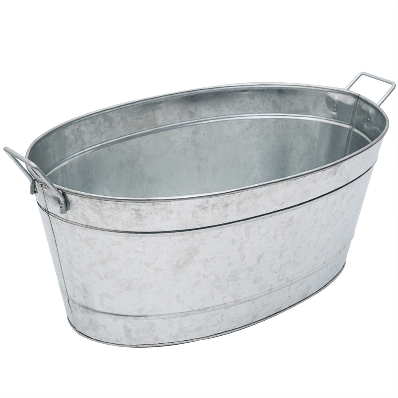 - Made of galvanized steel, for indoor and outdoor use, with two riveted side handles for carrying, Oval Tub measures 24"L including handles x 15"W x 9"H