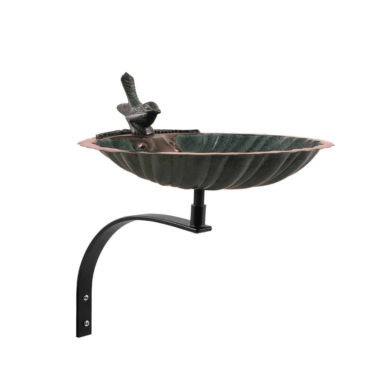 A small sculpted bird perches on top of this romantic Wall-Mounted Scallop Birdbath. The ridged interior of the shell-shaped bowl is enhanced by a verdigris patina. Ideal for porches, decks and fence posts, the bowl has a threaded base that attaches to the wrought iron wall bracket. Two mounting holes and hardware are provided.
