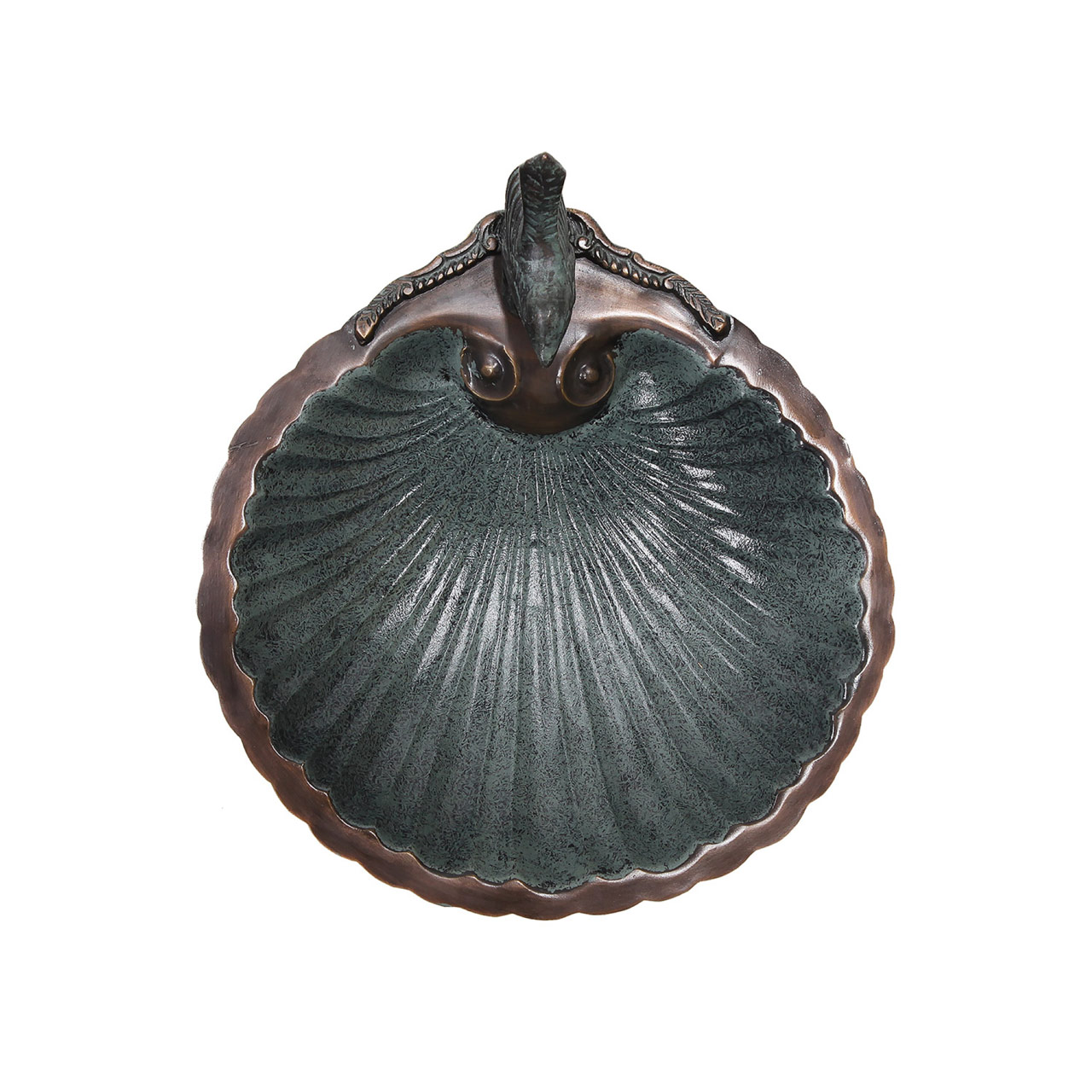 - A small sculpted bird perches on the rim of this shell-shaped birdbath bowl, ridged interior of the bowl is enhanced by a verdigris patina