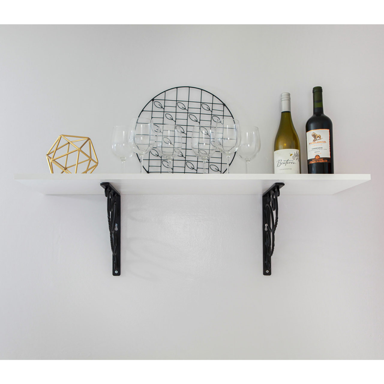 - Wrought Iron with a traditional scroll design for elegant and strong shelf support