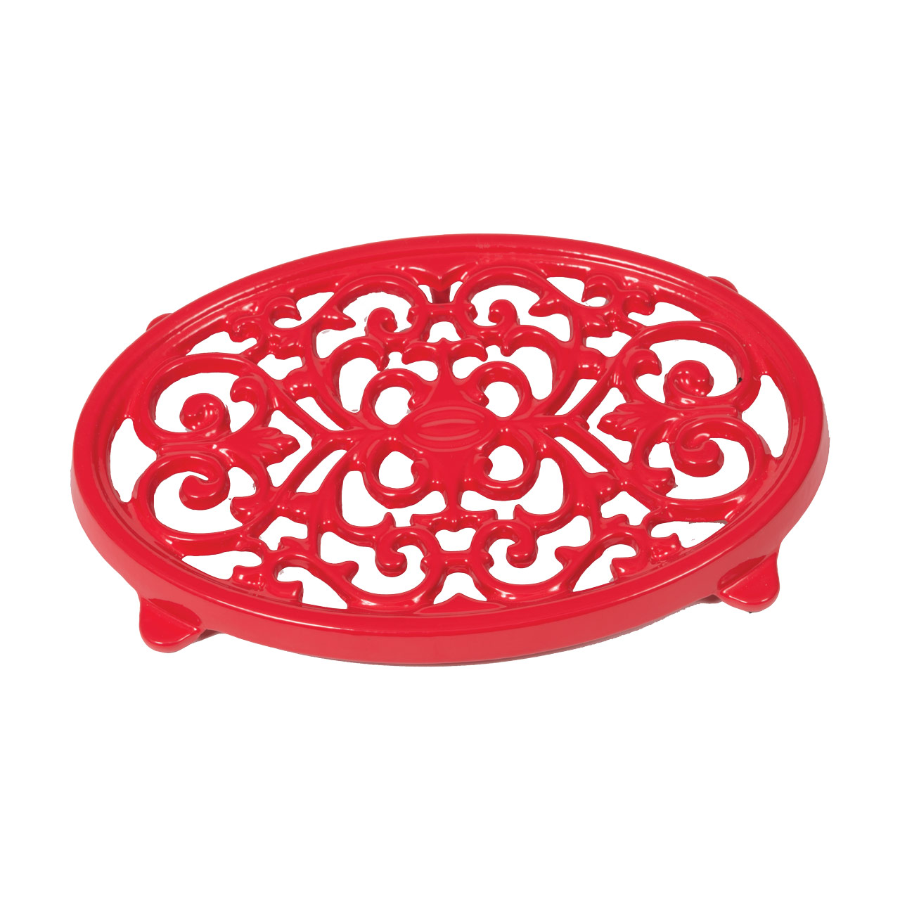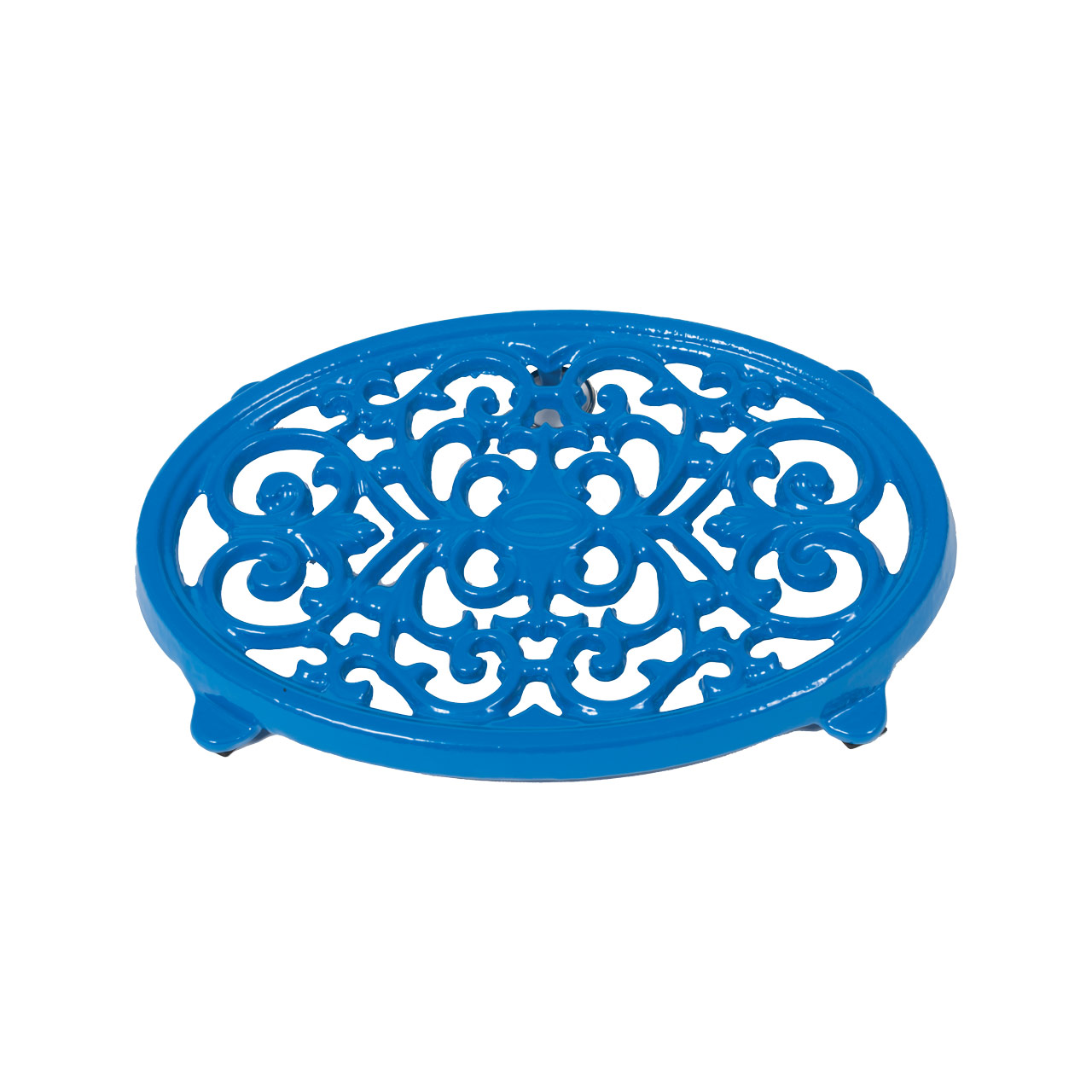 The Dagan Oval Enamel Trivet adds a pop of color and functionality to your hearth or kitchen. Crafted from durable enamel with a choice of blue or red finish, this 9 x 6.5-inch trivet provides a stable, heat-resistant surface for hot kettles, pots, or cookware. Its elegant oval shape combines practicality with style, making it a perfect accessory for everyday use or entertaining.