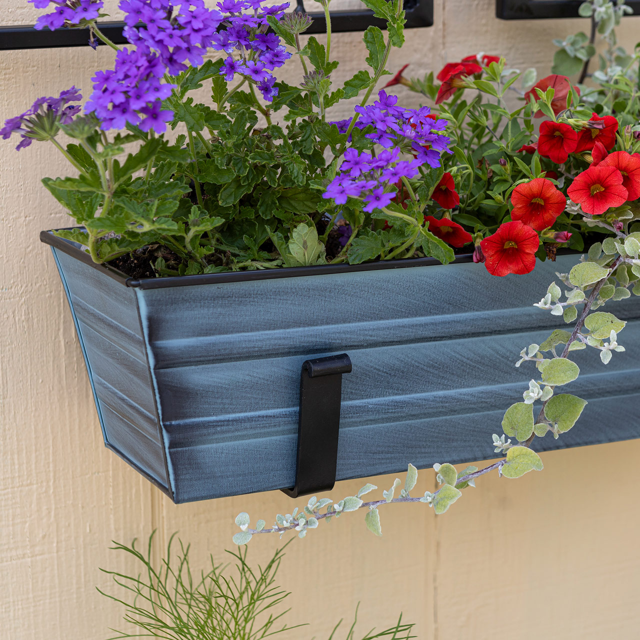 Add curb appeal to a front porch, create a container garden, or decorate with seasonal plantings on a balcony or deck. This Small Flower Box Kit with Wall Brackets has two wall-mounted brackets that simply and securely hold our Small Nantucket Blue Galvanized Flower Box planter. The sturdy brackets are made from wrought iron with a durable Black powder coated Finish. For easy installation, place the two wall brackets at the desired width apart and secure with stainless steel screws provided. Fill the box with favorite plants and place within the brackets. Kits are available in all four Flower Box colors, in three sizes, or with top-mounted Railing Brackets.