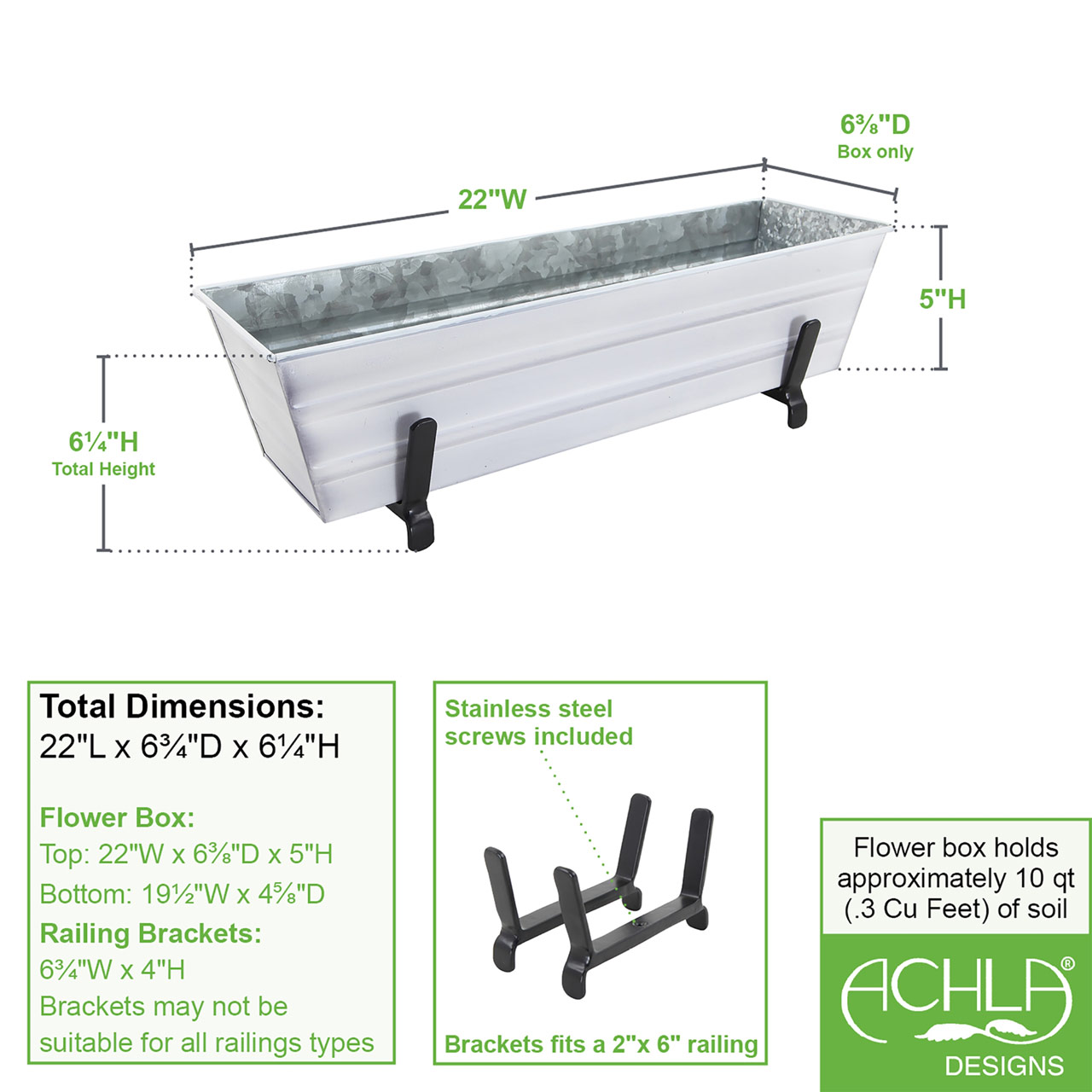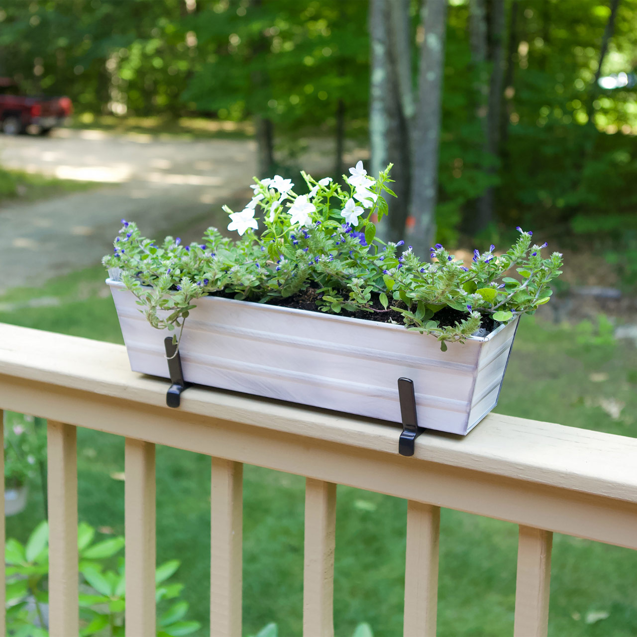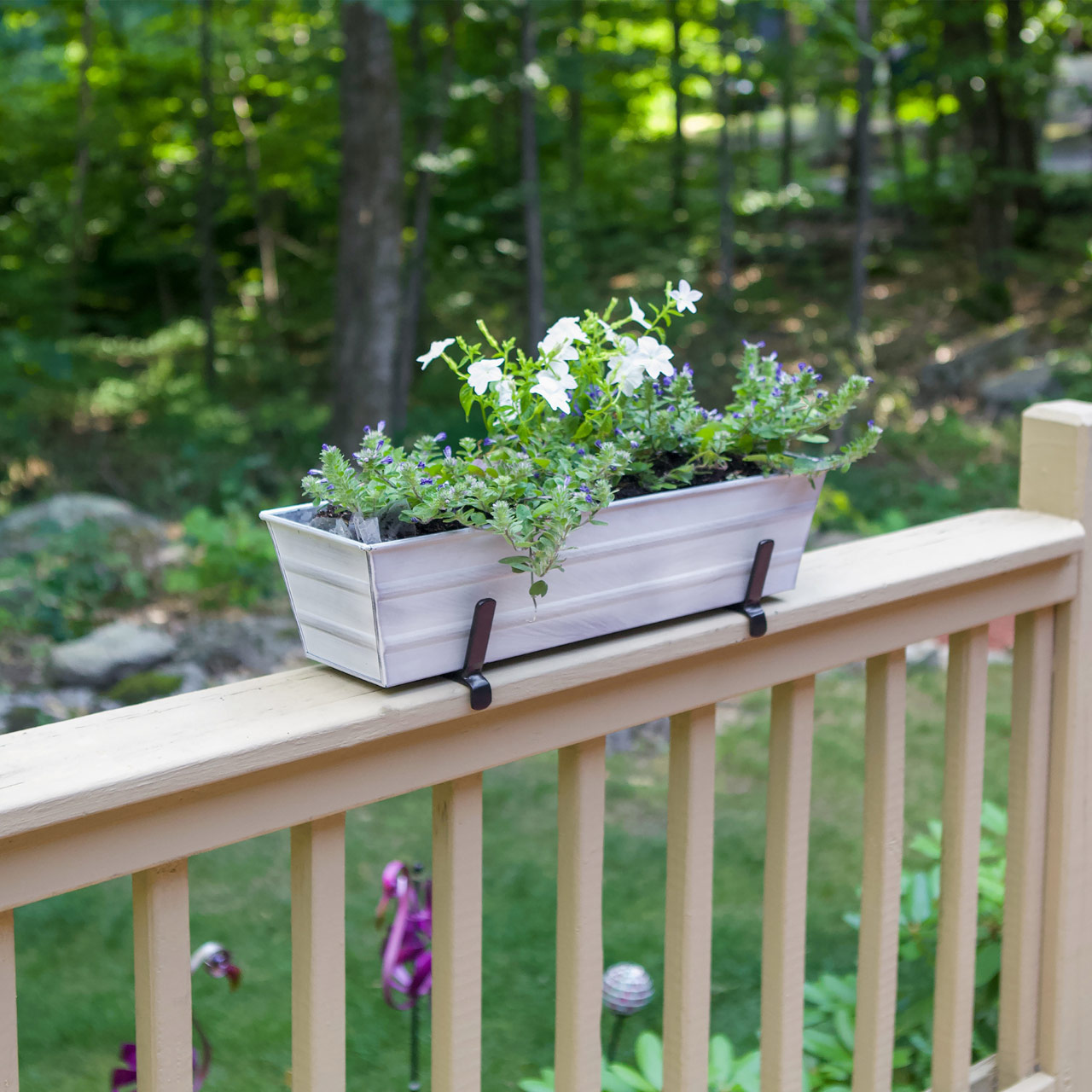 Add curb appeal to a front porch, create a container garden, or decorate with seasonal plantings on a balcony or deck. Our Small Flower Box Kit for 2 x 6 Railings has two top-mounted brackets that simply and securely hold our Small Cape Cod White Galvanized Flower Box planter. For easy installation, place the two wrought iron brackets at the desired width apart and secure with stainless steel screws provided. Fill the box with your choice of planting and place within the brackets. Kits are also available for 2 x 6 inch railings for Medium and Large Flower Boxes, in all four Flower Box colors.